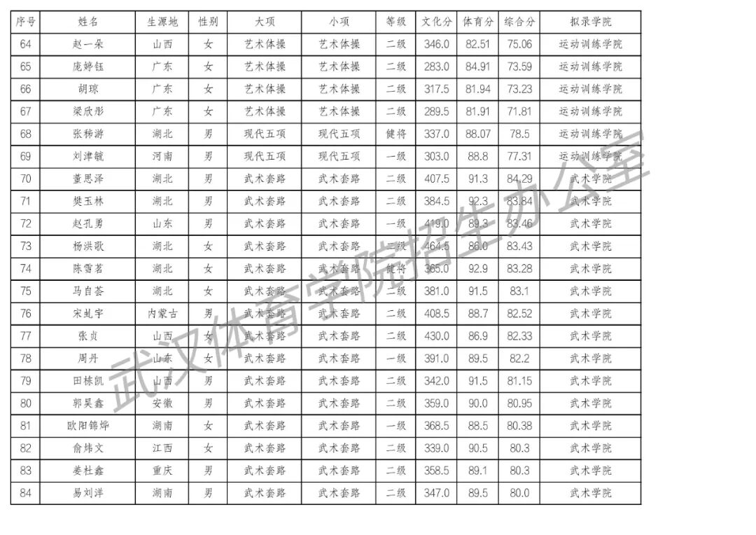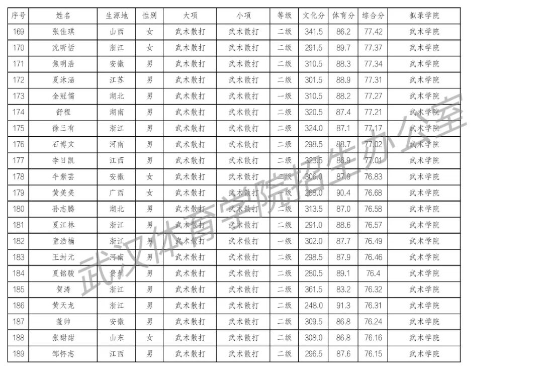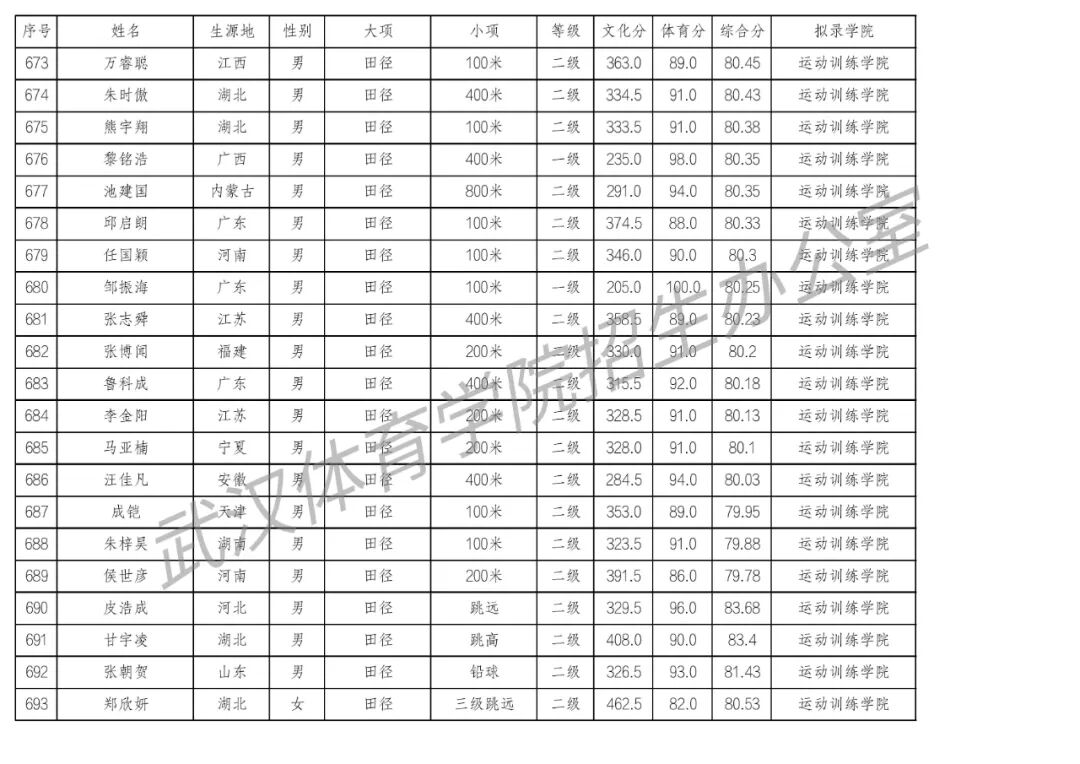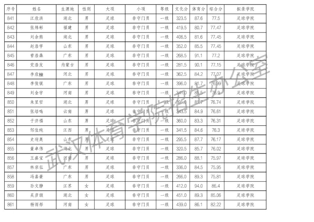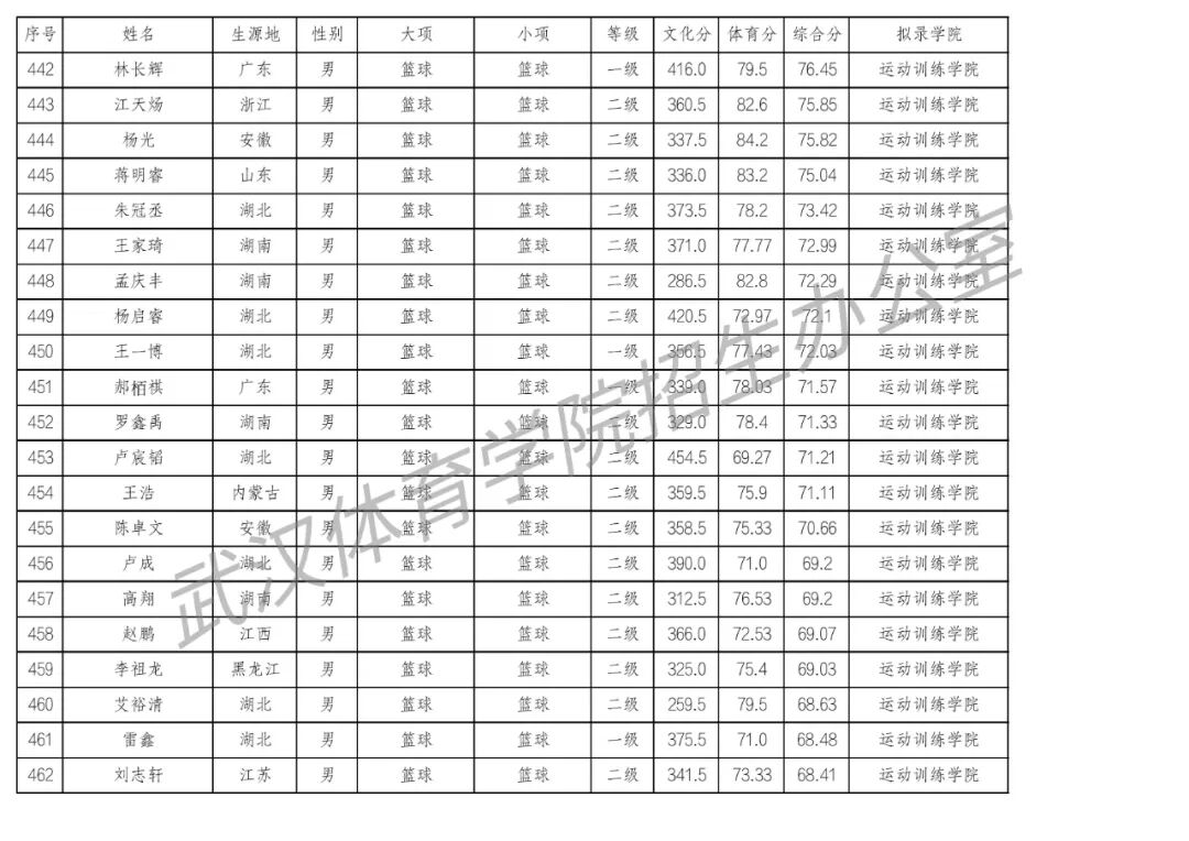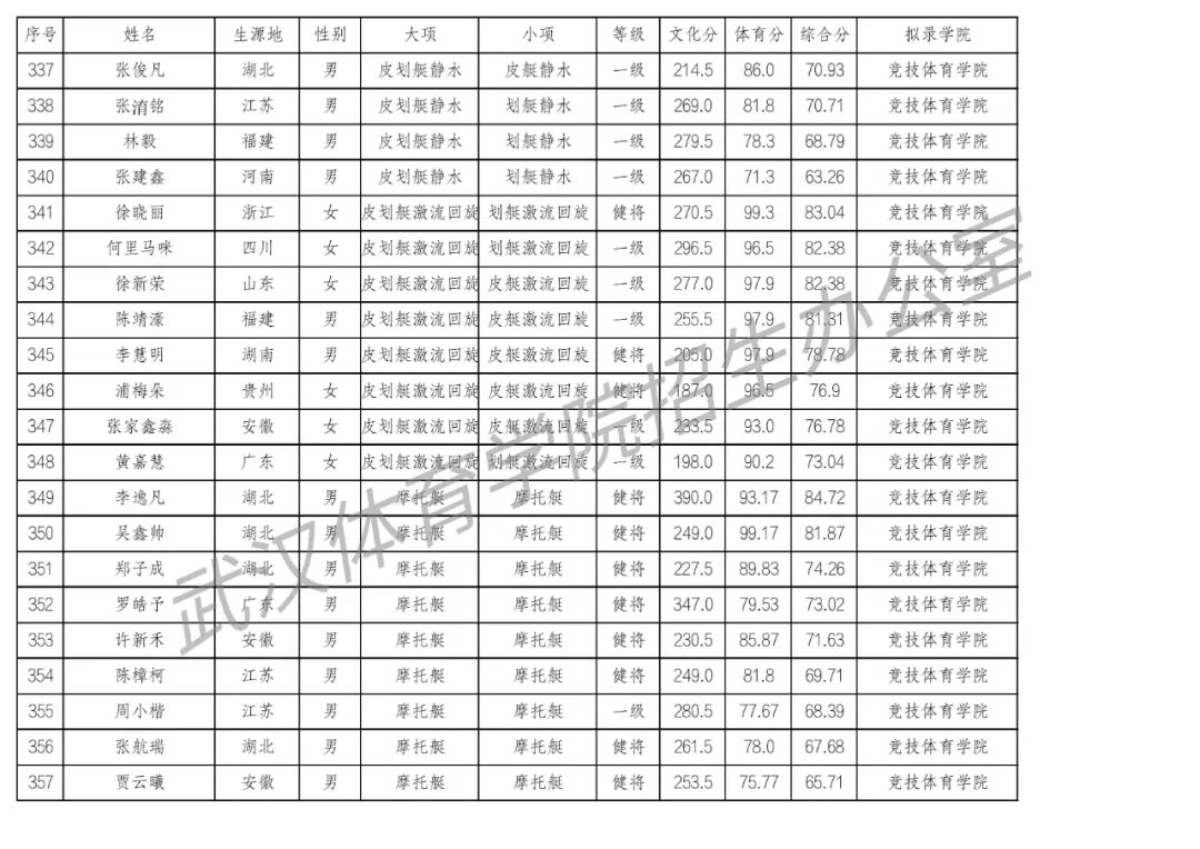 根据国家体育总局办公厅、教育部办公厅印发的《2025年普通高等学校运动训练、武术与民族传统体育专业招生管理办法》(体科字〔2024〕256号)和《武汉体育学院2025年运动训练、武术与民族传统体育、足球运动专业招生简章》相关要求及原则,现将一志愿拟录取名单进行公示,正式录取名单以教育部、国家体育总局、各省招生部门审核通过为准。