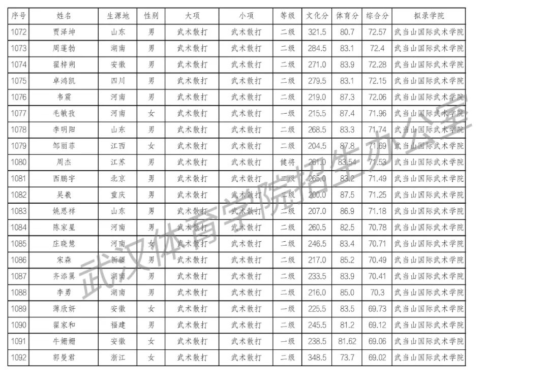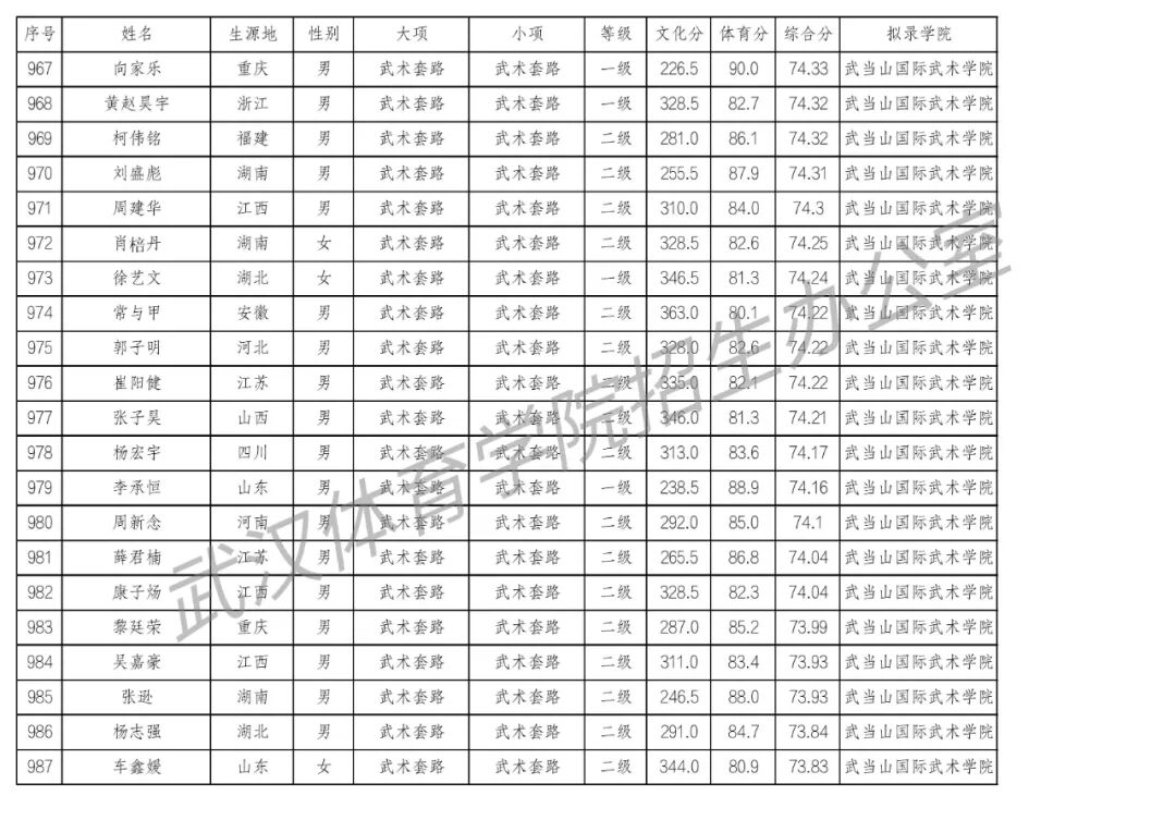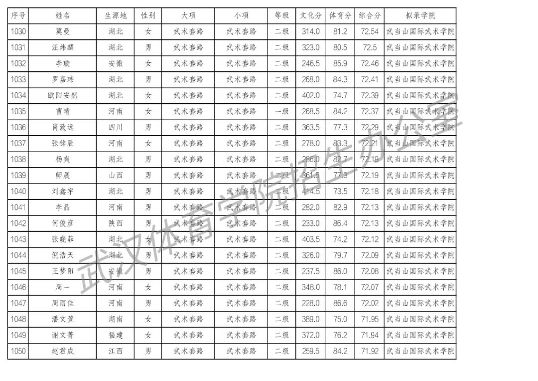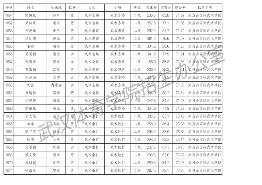 5.武汉体育学院武当山国际武术学院在武汉体育学院校本部录取结束后,从填报服从调剂到武汉体育学院武当山国际武术学院的考生中录取。