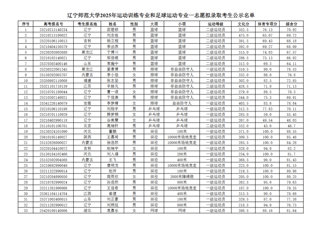 辽宁师范大学2025年运动训练专业和足球运动专业一志愿拟录取考生名单公示
