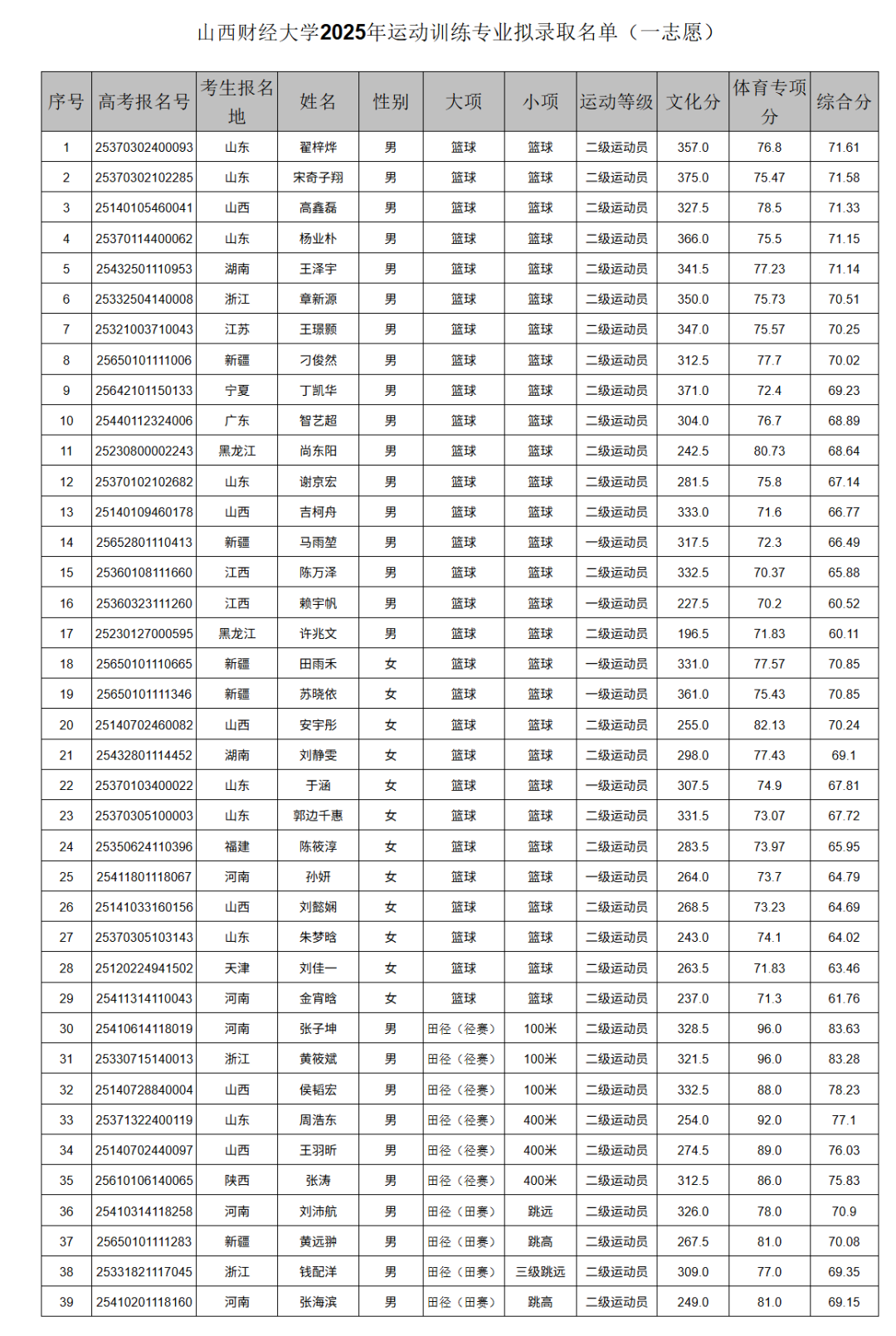 山西财经大学2025年运动训练专业拟录取名单公示(一志愿)