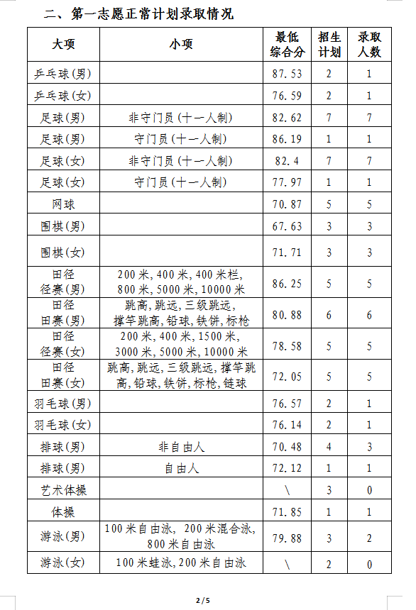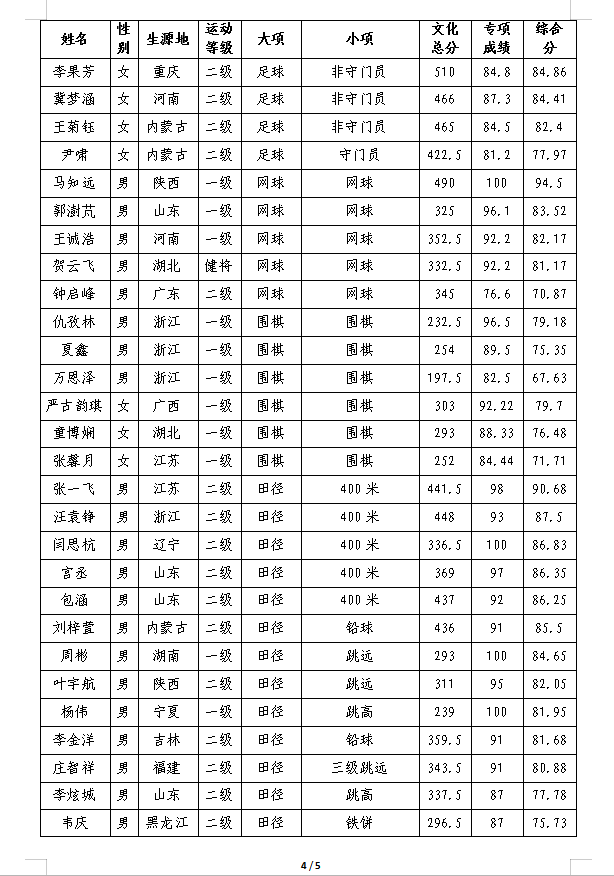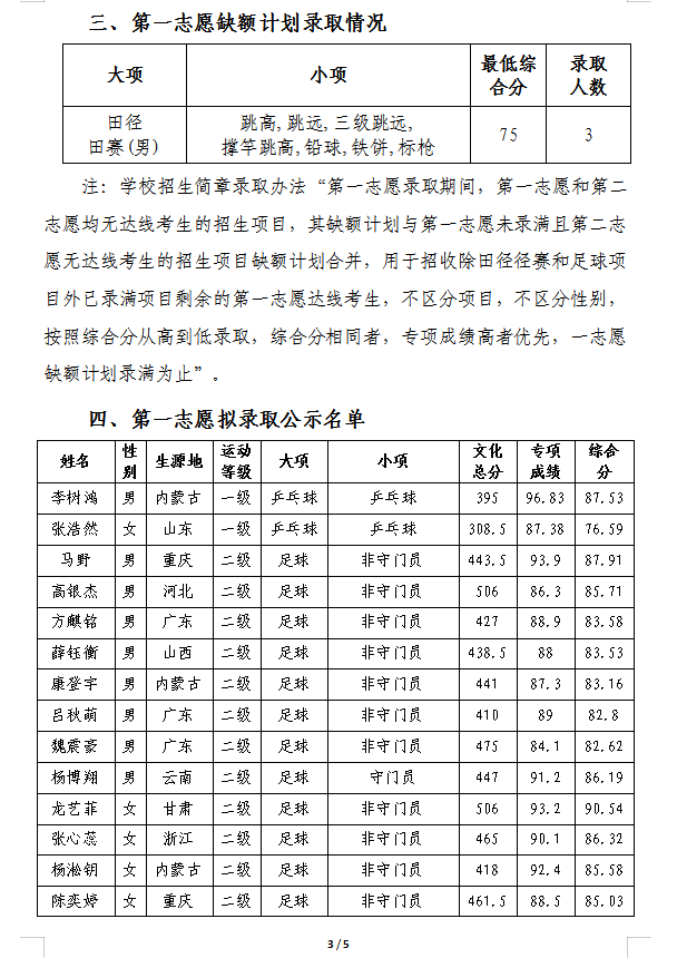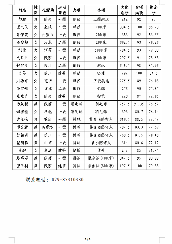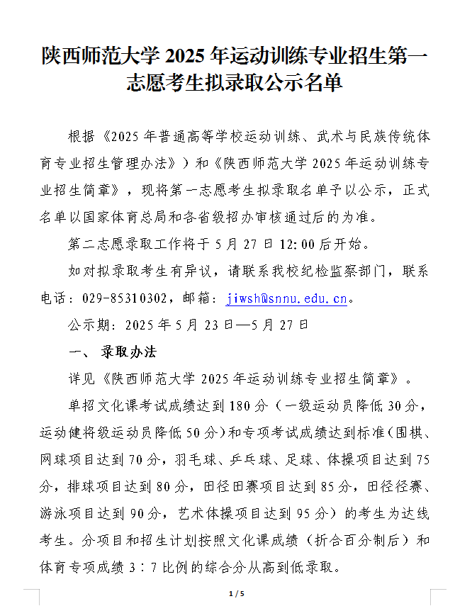 陕西师范大学2025年运动训练专业招生第一志愿考生拟录取公示名单
