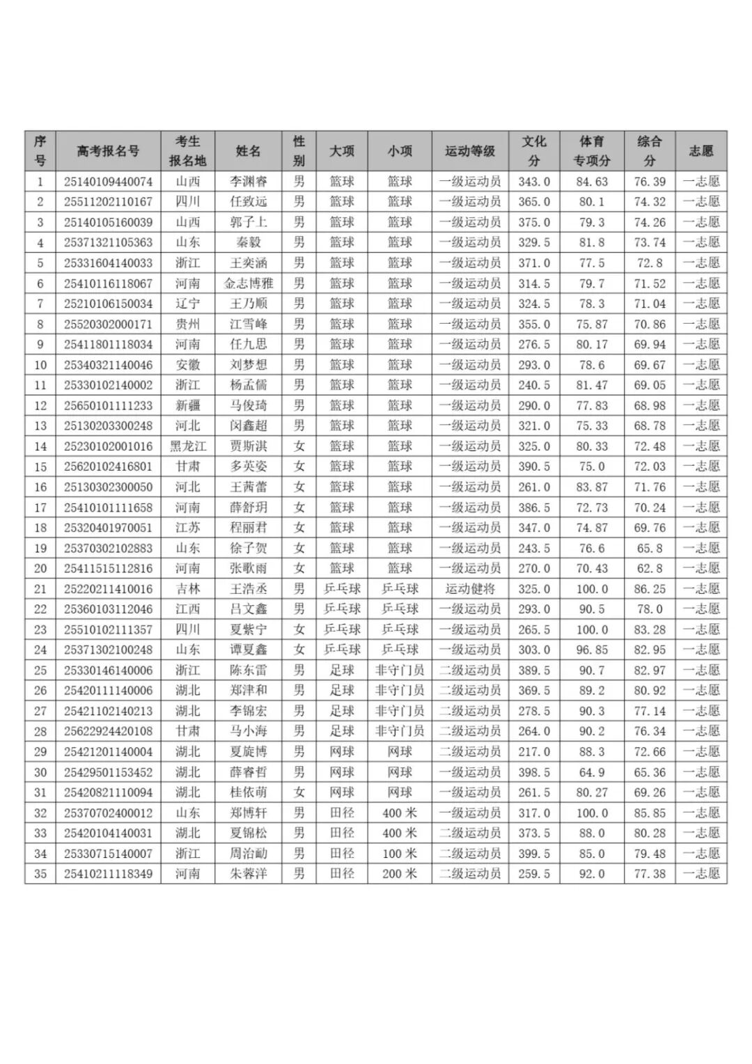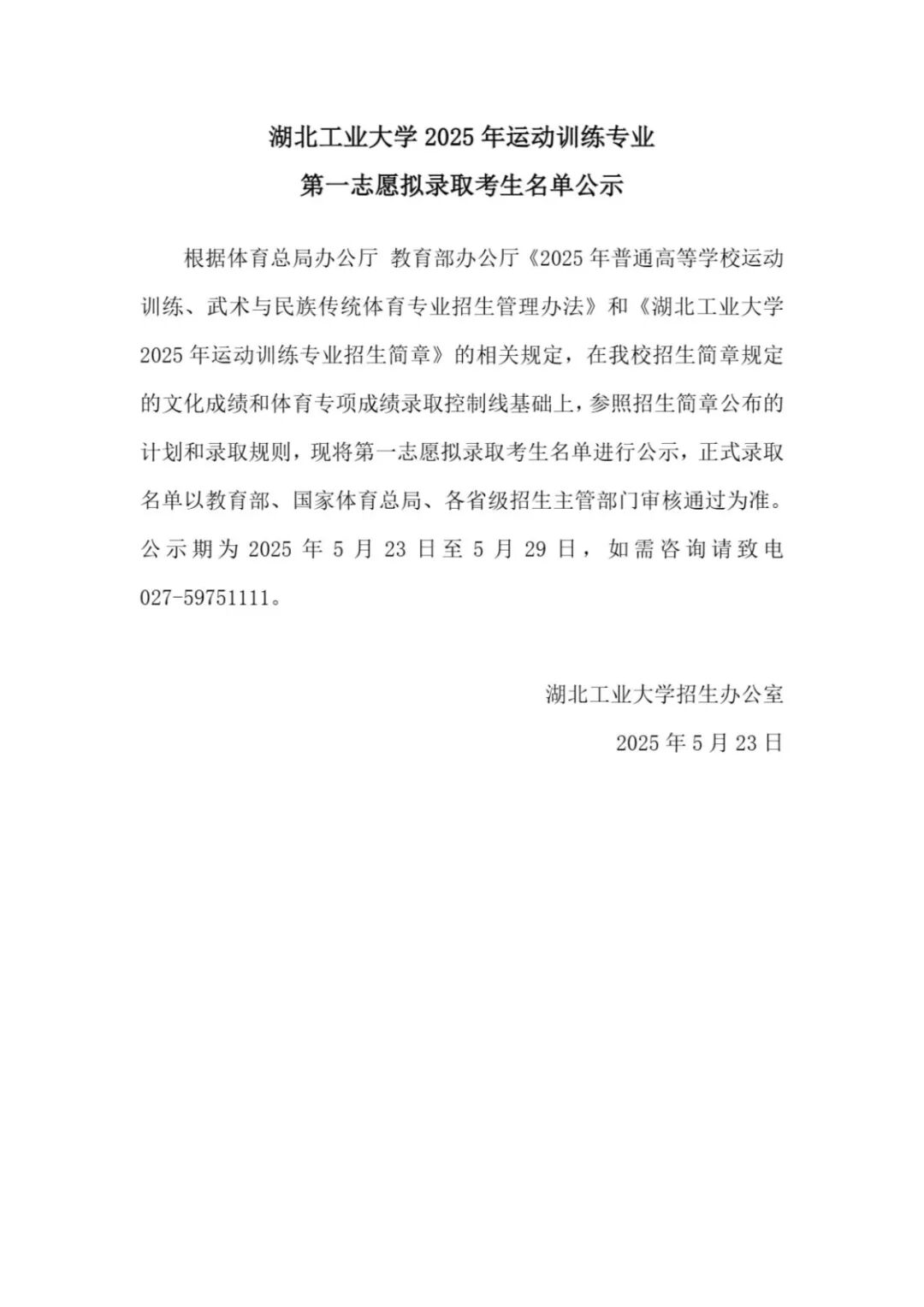 湖北工业大学2025年运动训练专业第一志愿拟录取考生名单公示