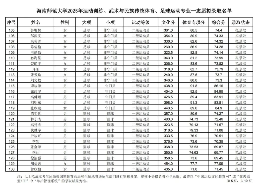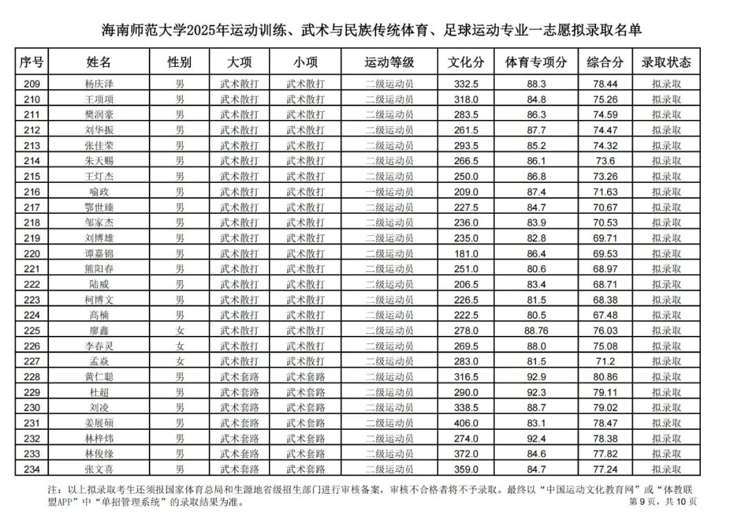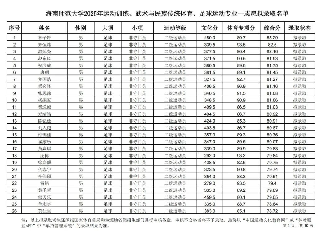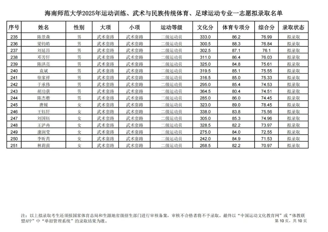 海南师范大学2025年运动训练、武术与民族传统体育、足球运动专业一志愿拟录取名单公示