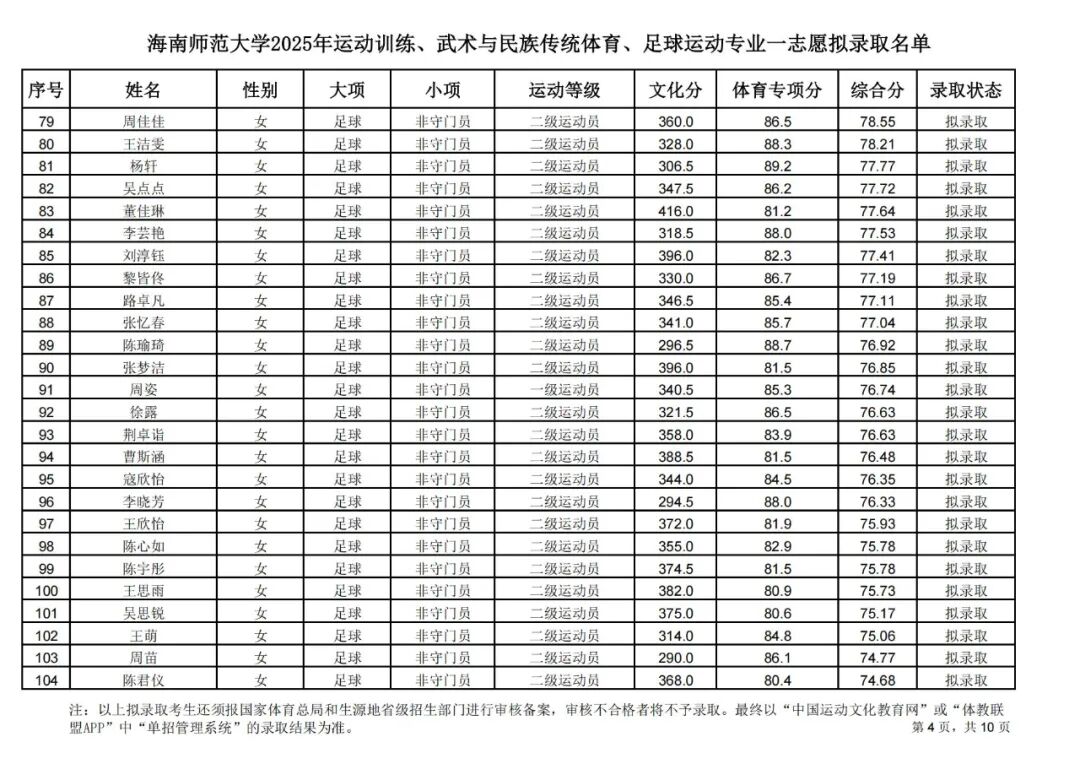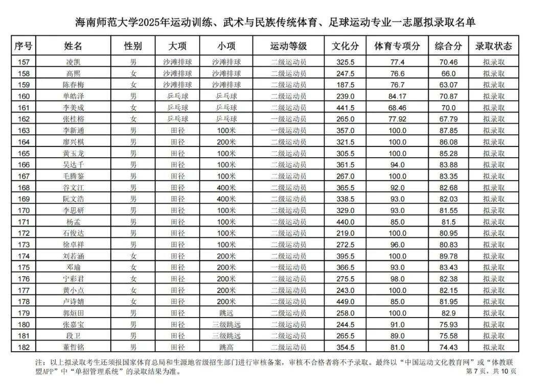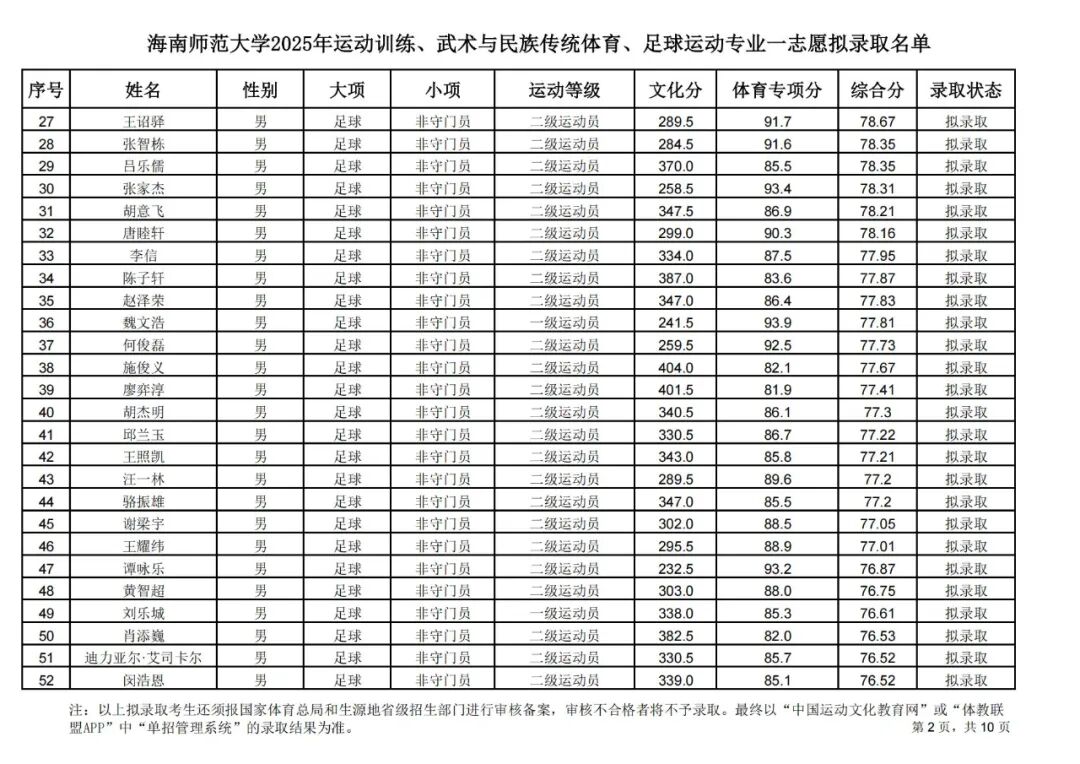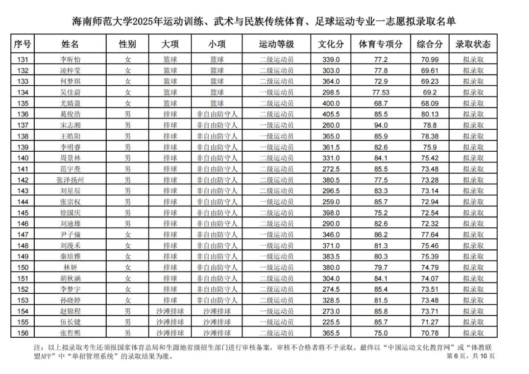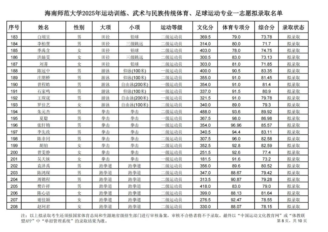 海南师范大学2025年运动训练、武术与民族传统体育、足球运动专业一志愿拟录取名单公示