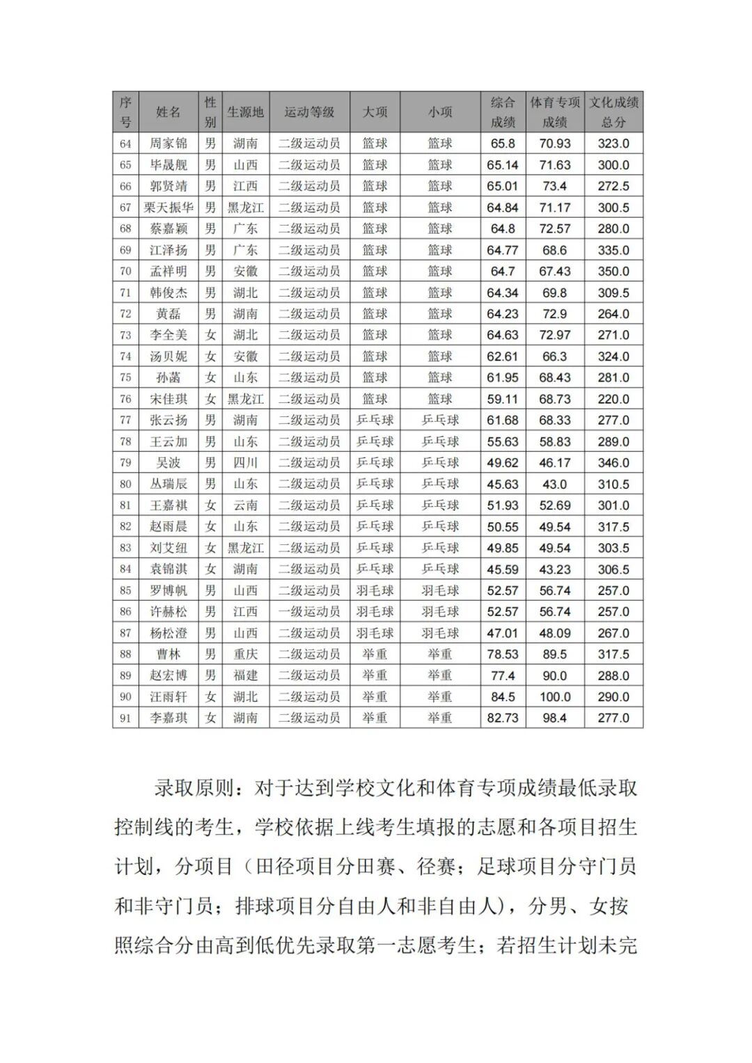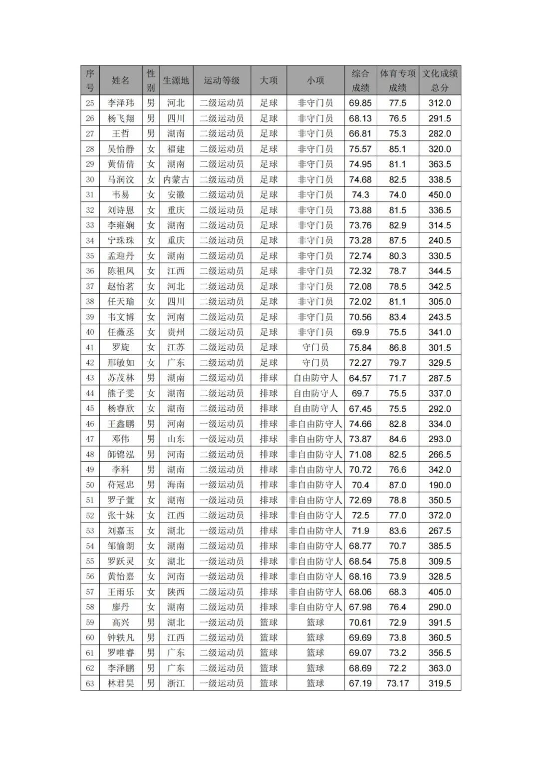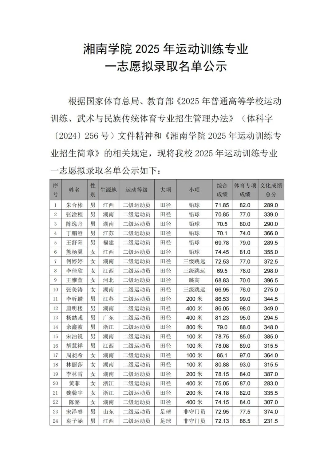 湘南学院2025年运动训练专业一志愿拟录取名单公示