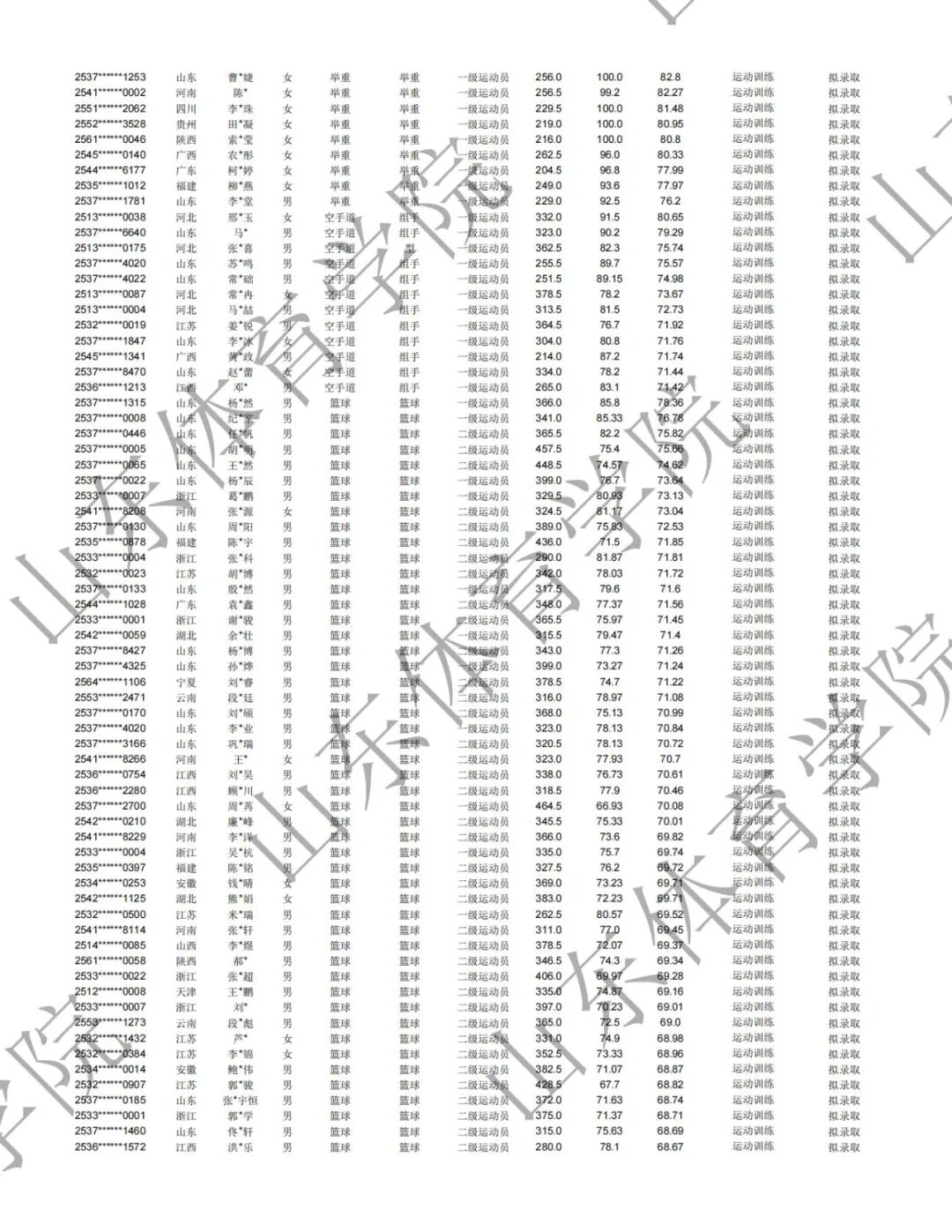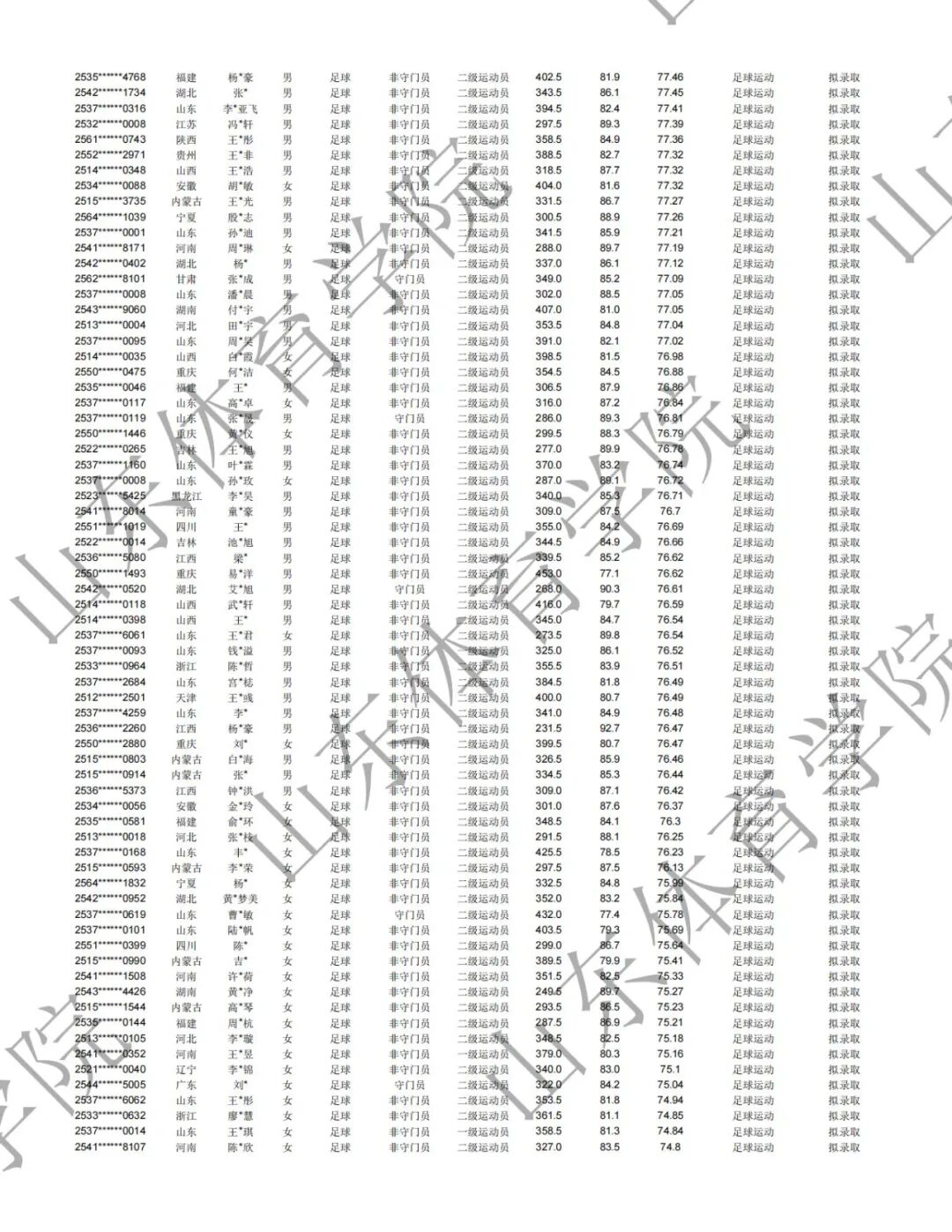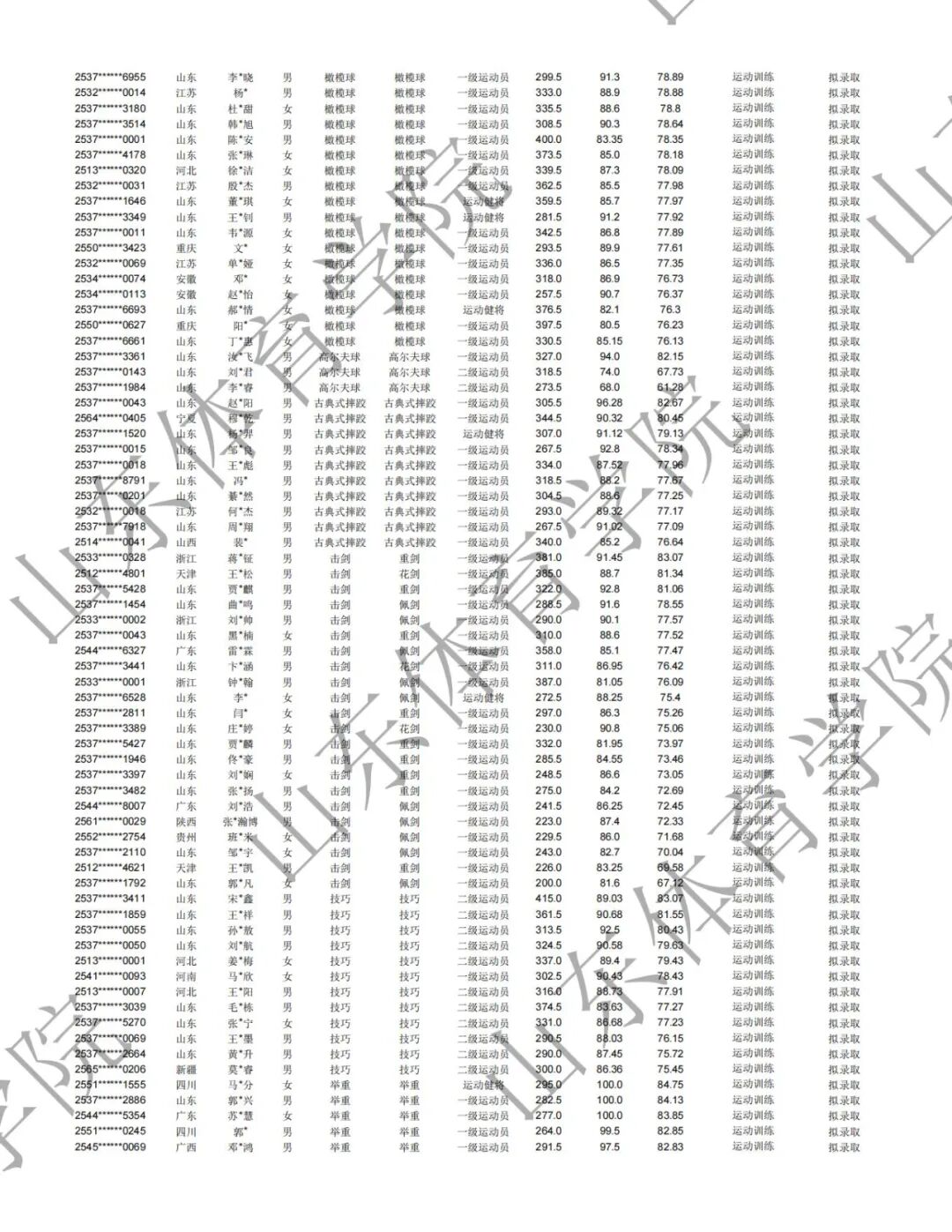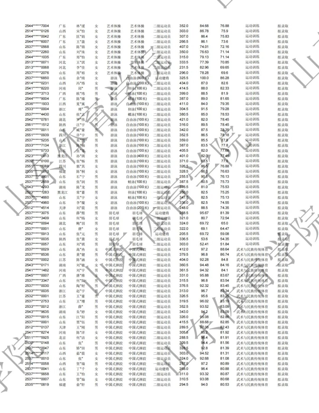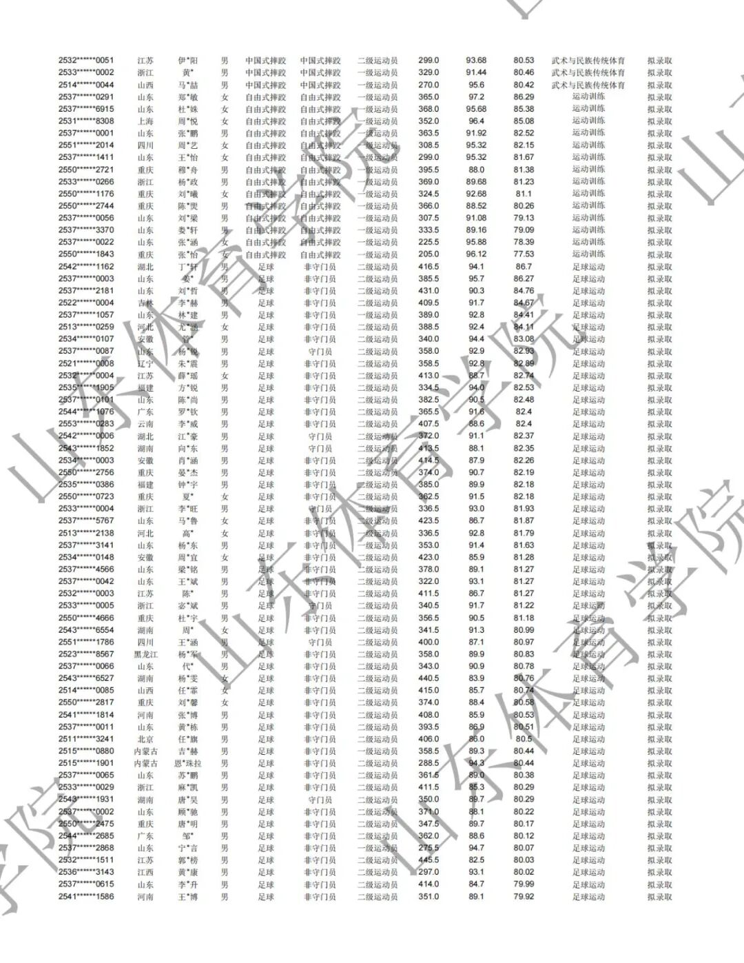 2025年山东体育学院运动训练、武术与民族传统体育、足球运动专业一志愿录取分数线及拟录取名单公示