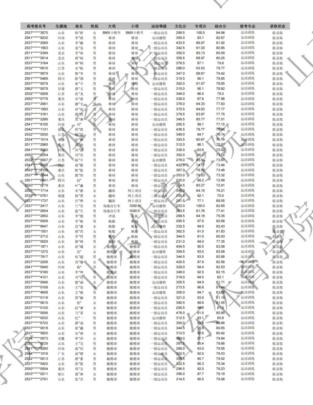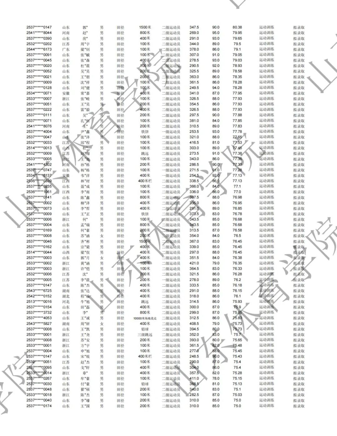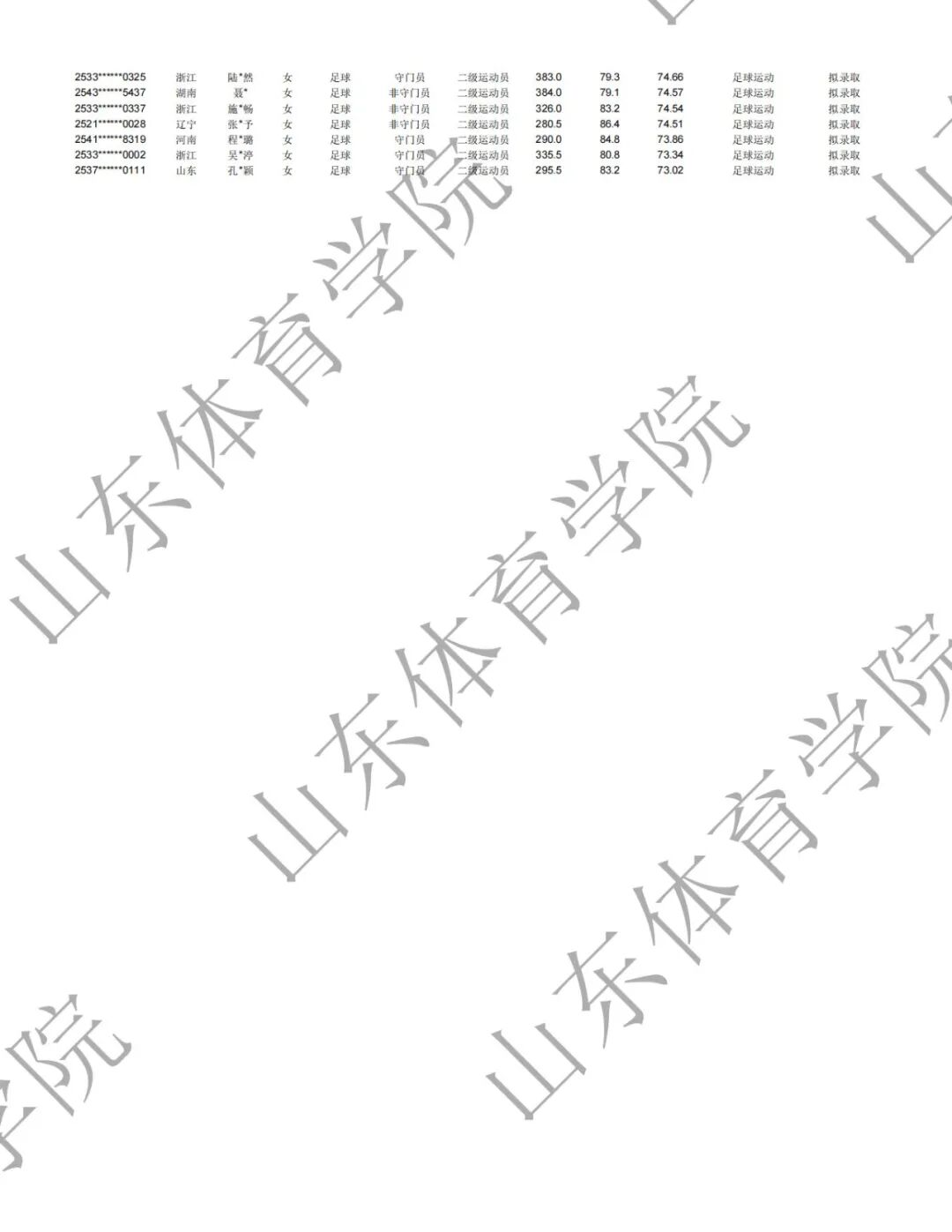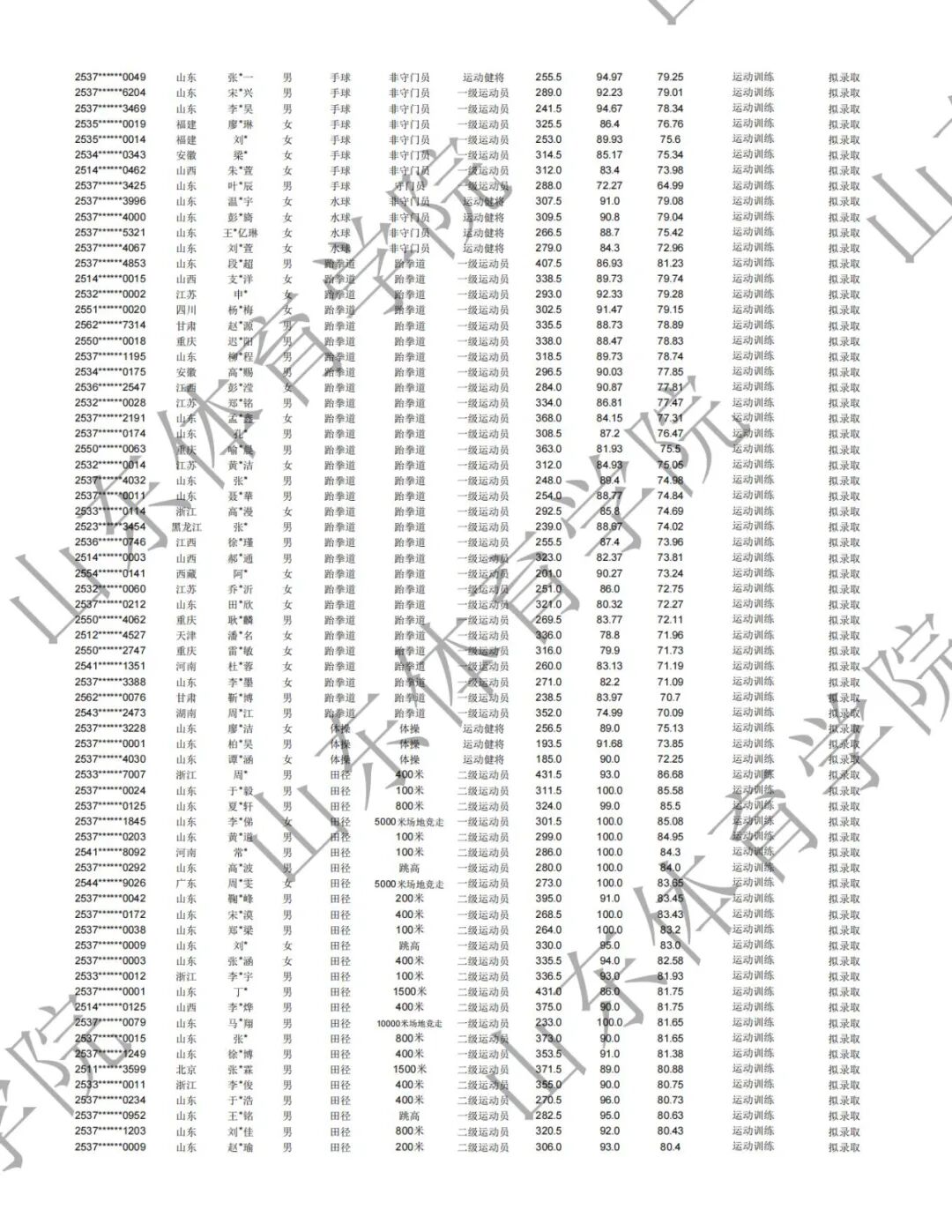 2025年山东体育学院运动训练、武术与民族传统体育、足球运动专业一志愿录取分数线及拟录取名单公示