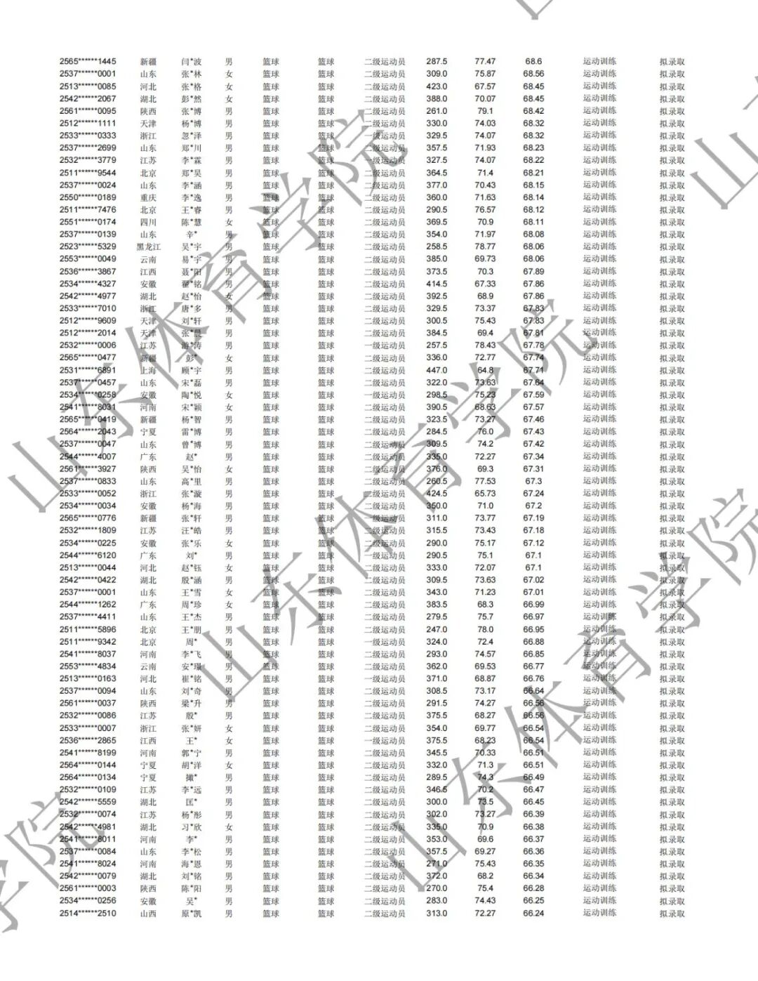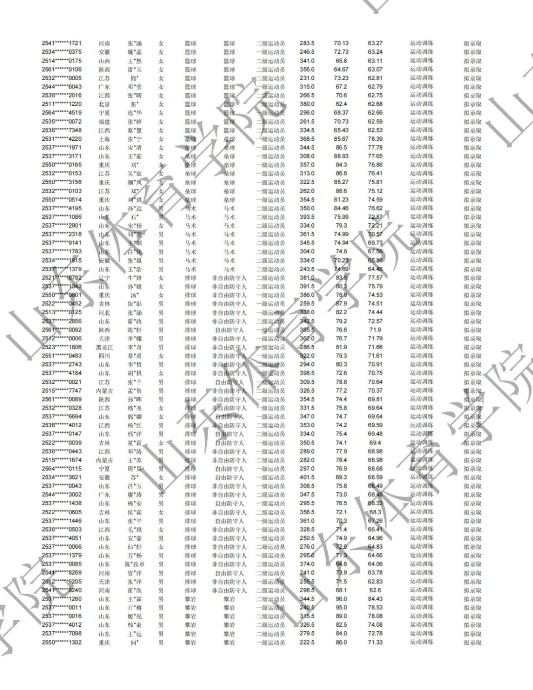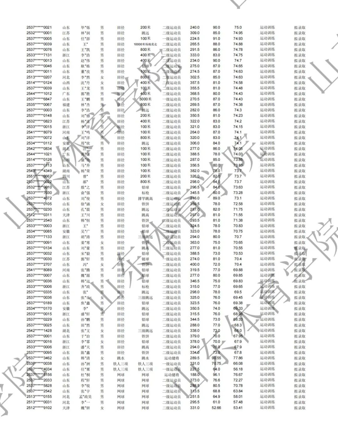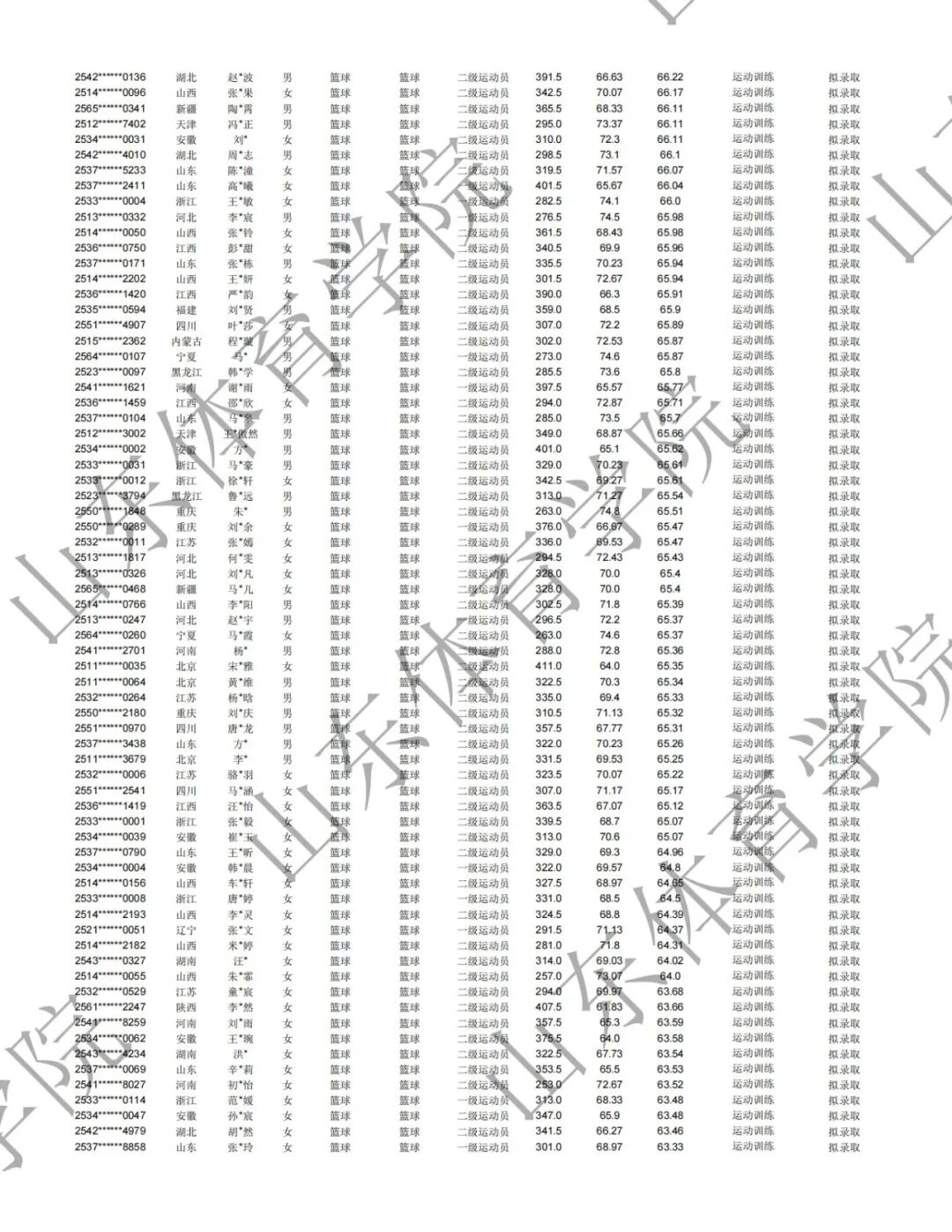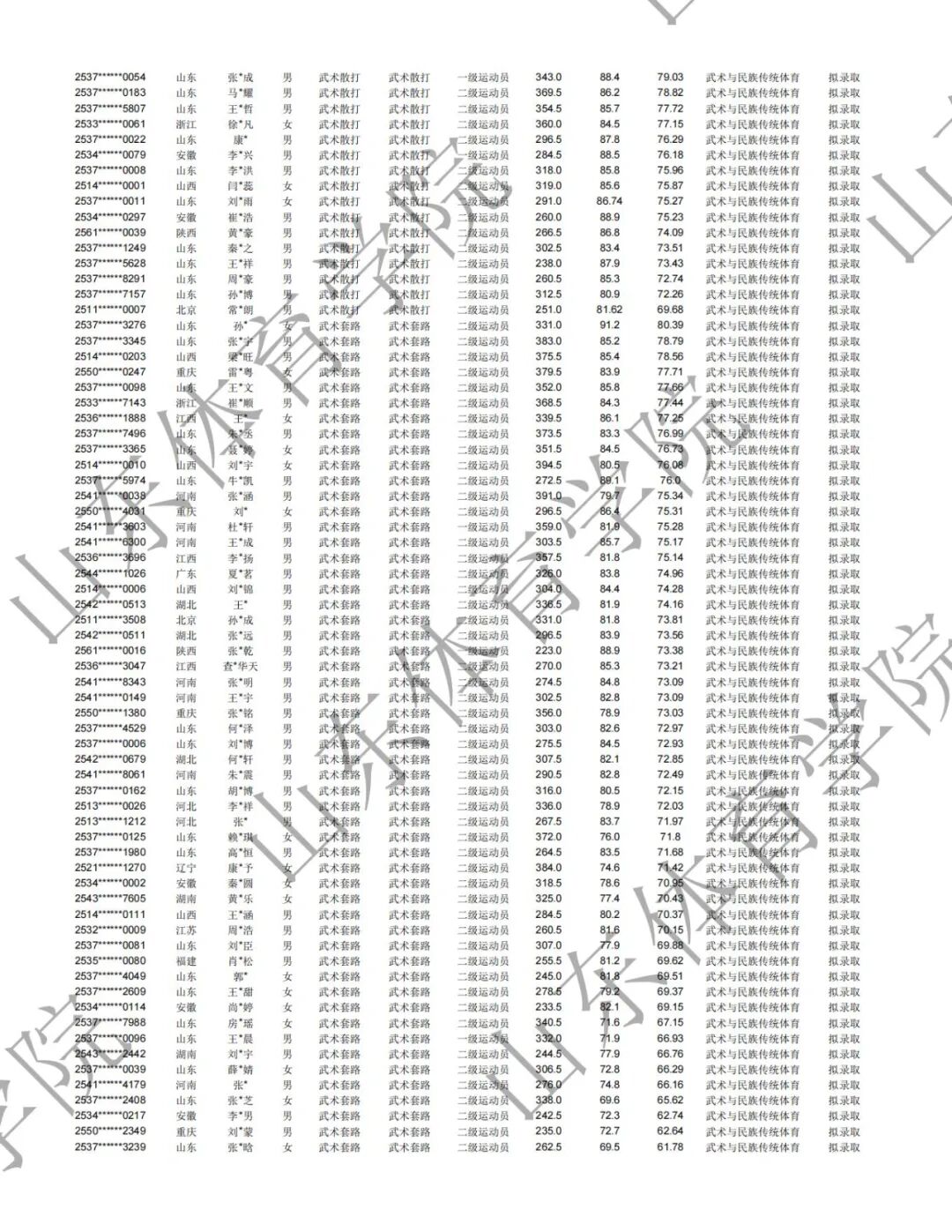 2025年山东体育学院运动训练、武术与民族传统体育、足球运动专业一志愿录取分数线及拟录取名单公示