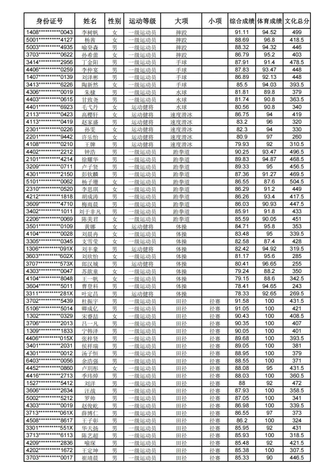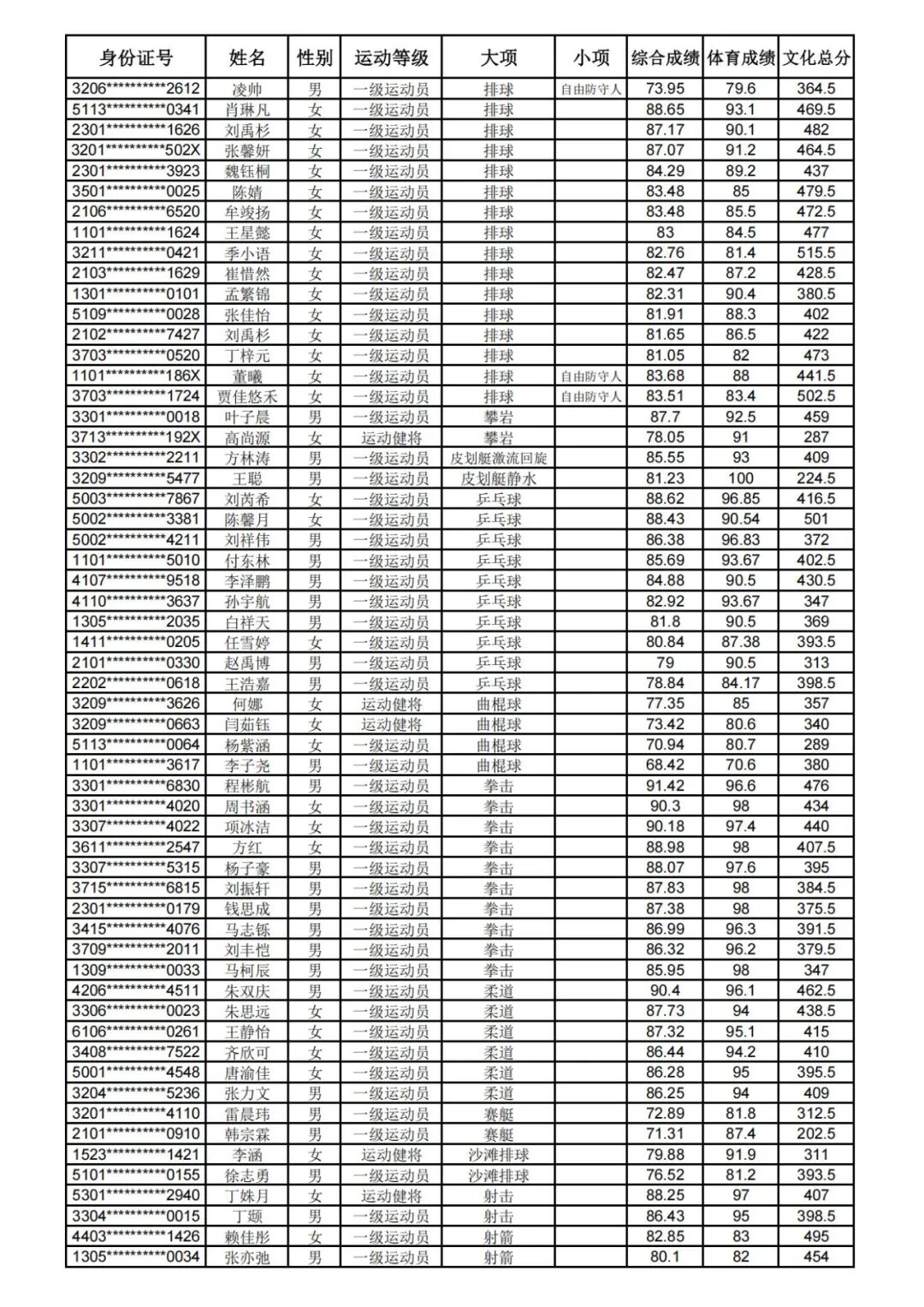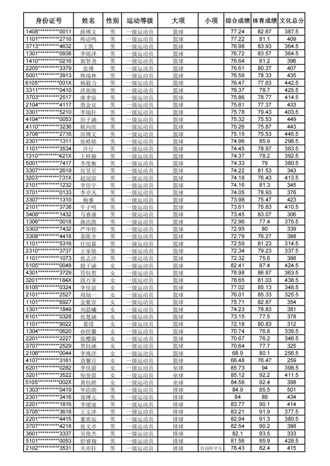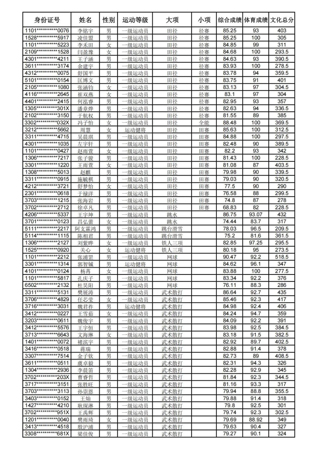 一、遵循“公平、公正、公开”原则,结合国家体育事业发展战略需求、学校改革发展、教学条件、师资力量等情况,根据已向社会公布的“北京体育大学2025年运动训练、武术与民族传统体育专业招生分项目计划及最低录取控制分数线”相关要求,确定2025年体育单招一志愿拟录取名单。其中,经学校招生工作领导小组会议、校长办公会研究决定,为落实国家大力振兴发展“三大球”部署要求,结合学校办学条件和发展需求,个别项目招生计划进行增量调整,具体以我校官方公布的拟录取名单(包括一志愿、二志愿)为准。