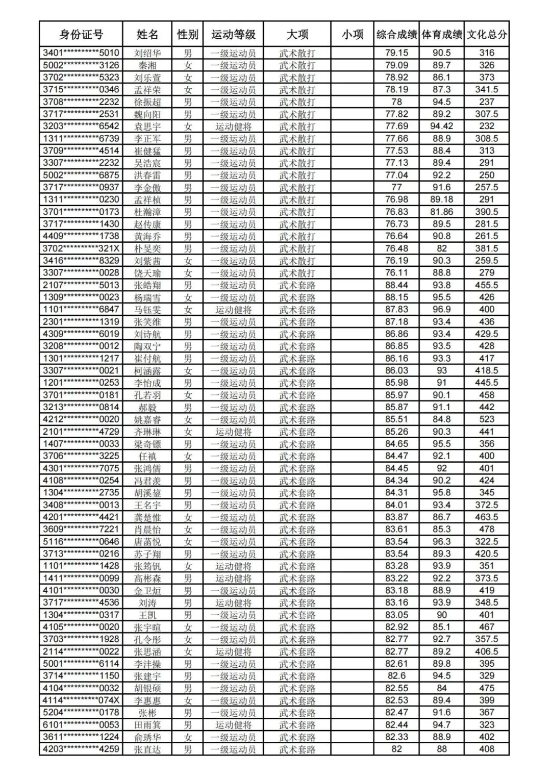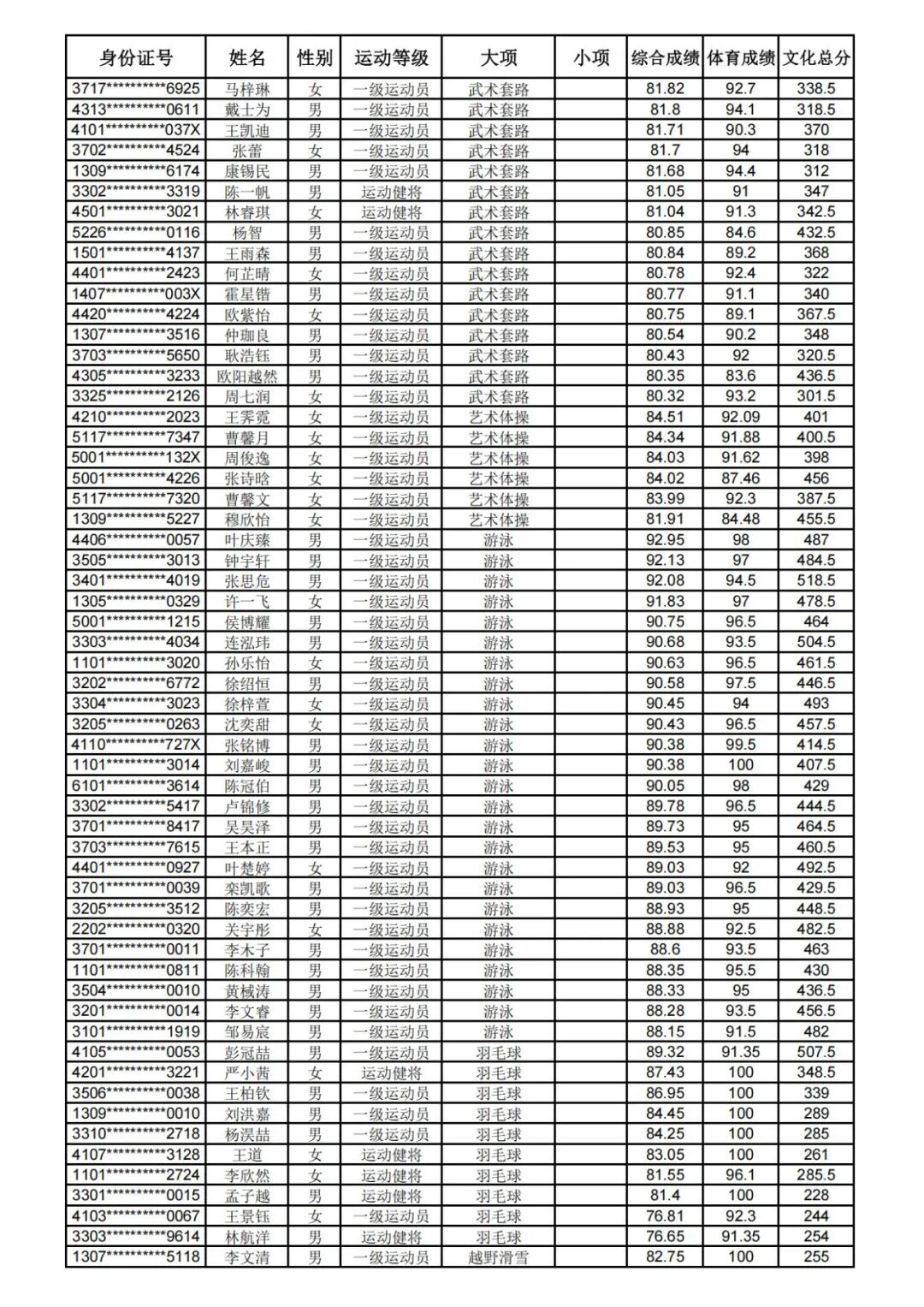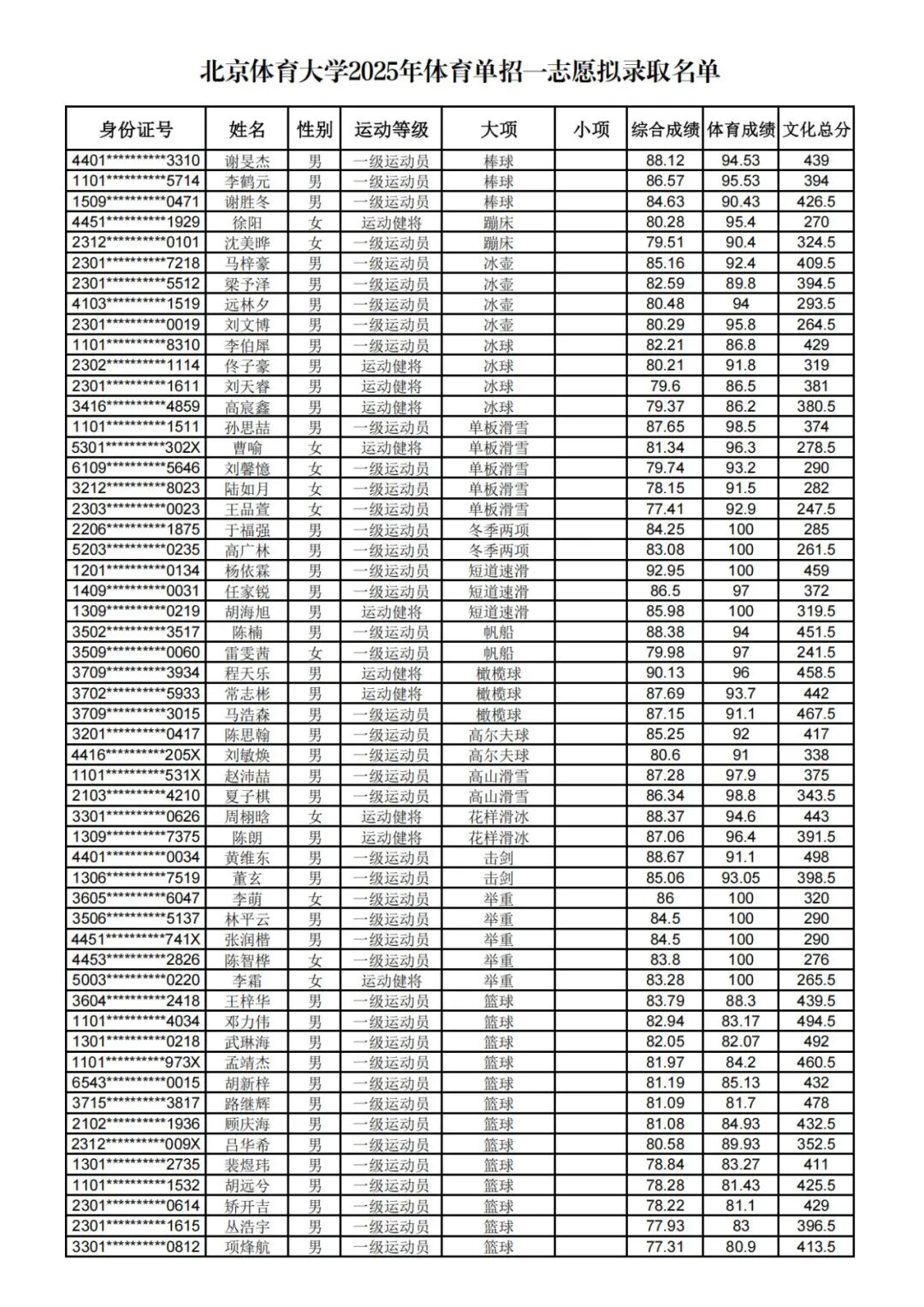 北京体育大学2025年运动训练、武术与民族传统体育专业招生考试录取原则及一志愿拟录取名单