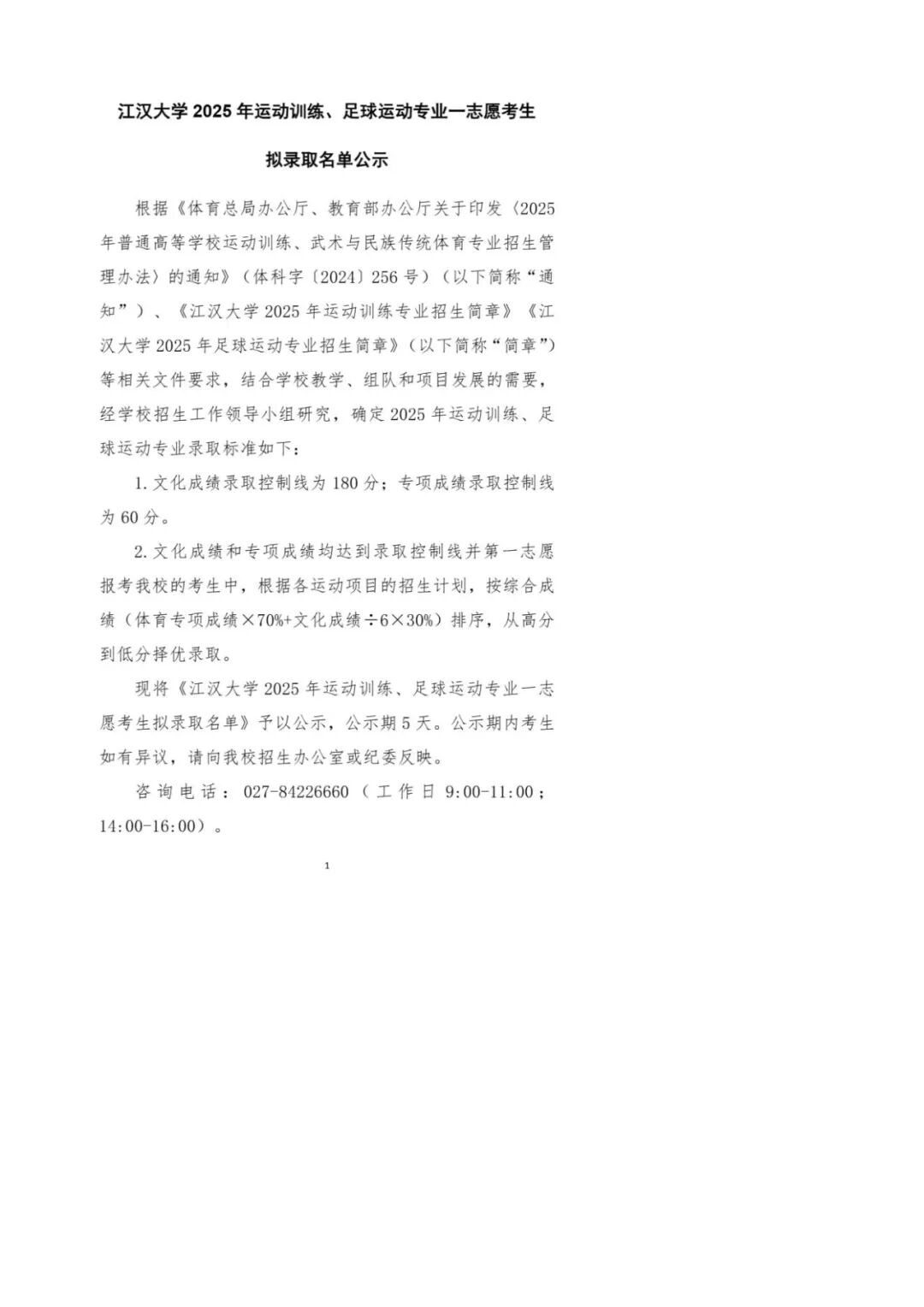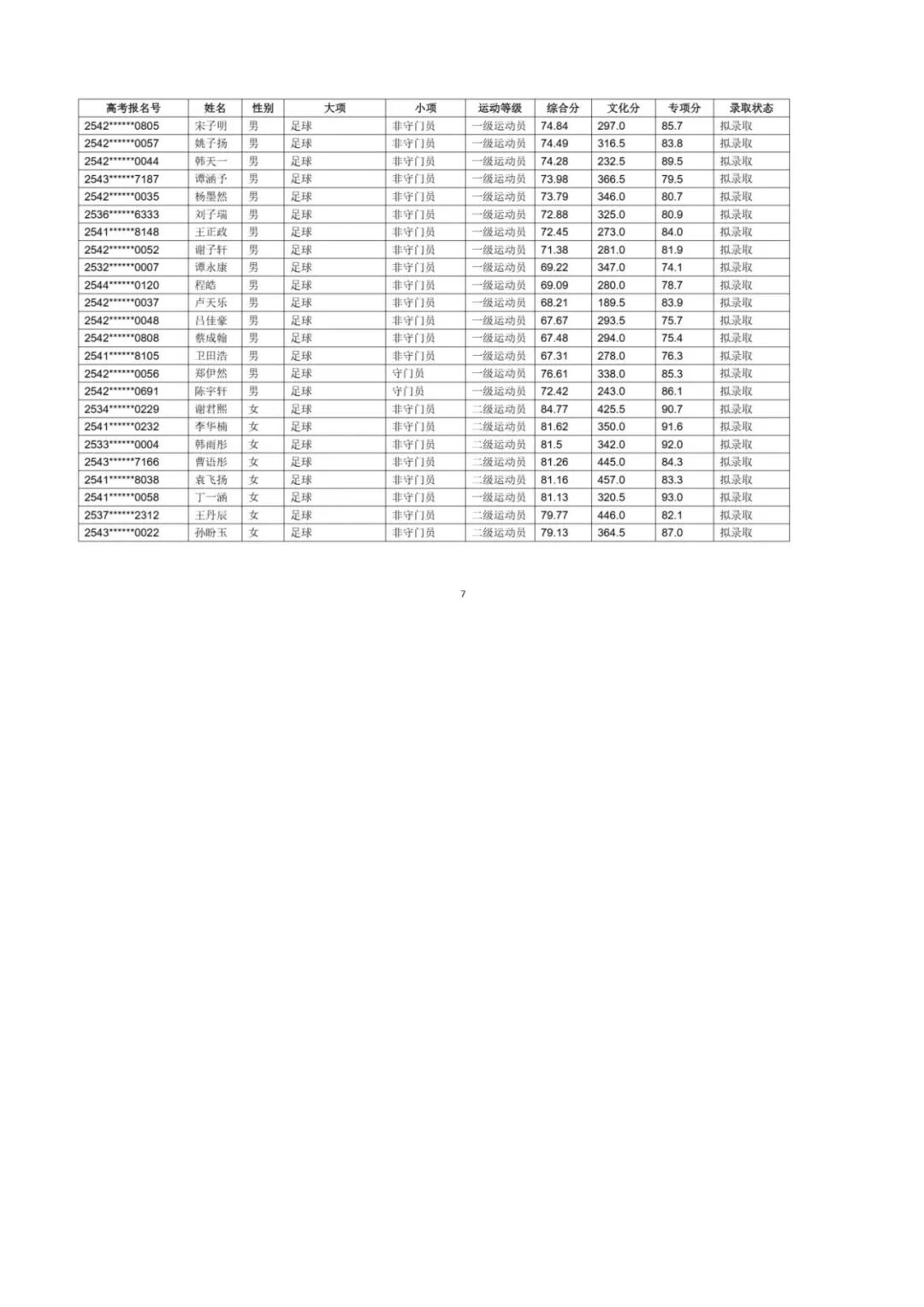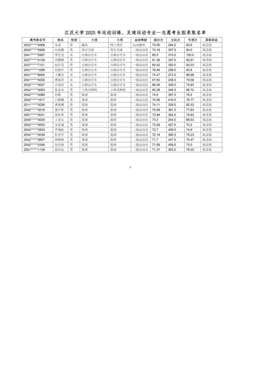 江汉大学2025年运动训练、足球运动专业一志愿考生拟录取名单公示