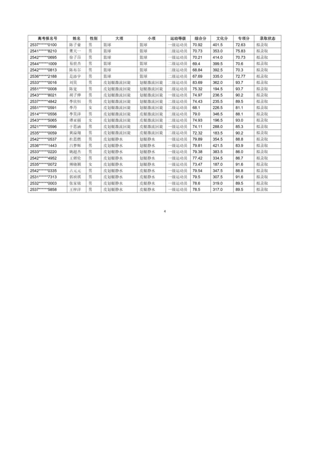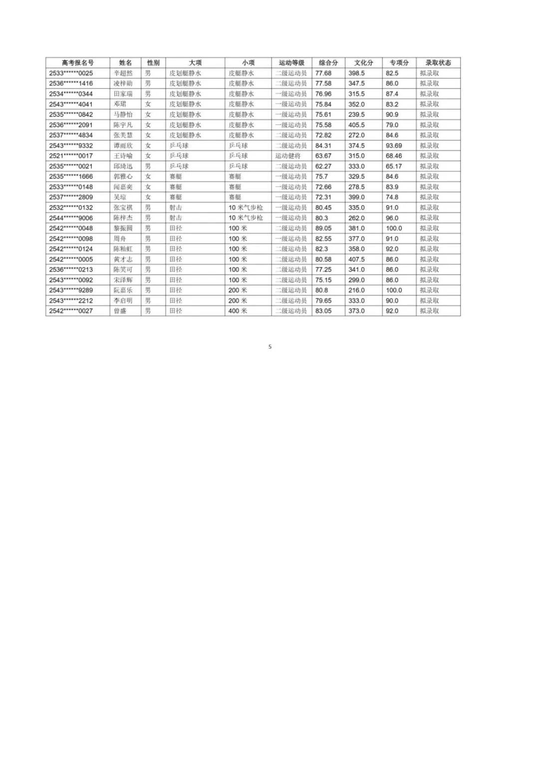 江汉大学2025年体育单招拟录取名单
