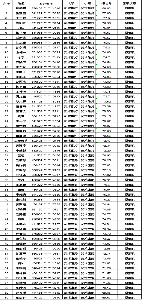 根据国家体育总局办公厅、教育部办公厅制定的《2025年普通高等学校运动训练、武术与民族传统体育专业招生管理办法》(体科字〔2024〕256号)规定及学校公布的《云南民族大学2025年武术与民族传统体育专业招生简章》,现将云南民族大学2025年武术与民族传统体育专业拟录取名单进行公示。