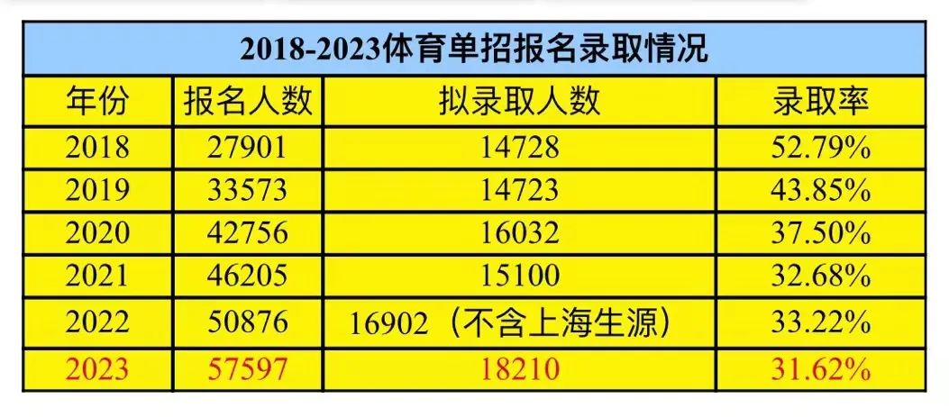 2023年体育单招整体报考人数突破5.7万人,录取总人数为18210人,整体录取率为31.62%,今年整体录取率创历史新低!这一数据显示,越来越多的考生面临着升学的困境,竞争更加激烈。