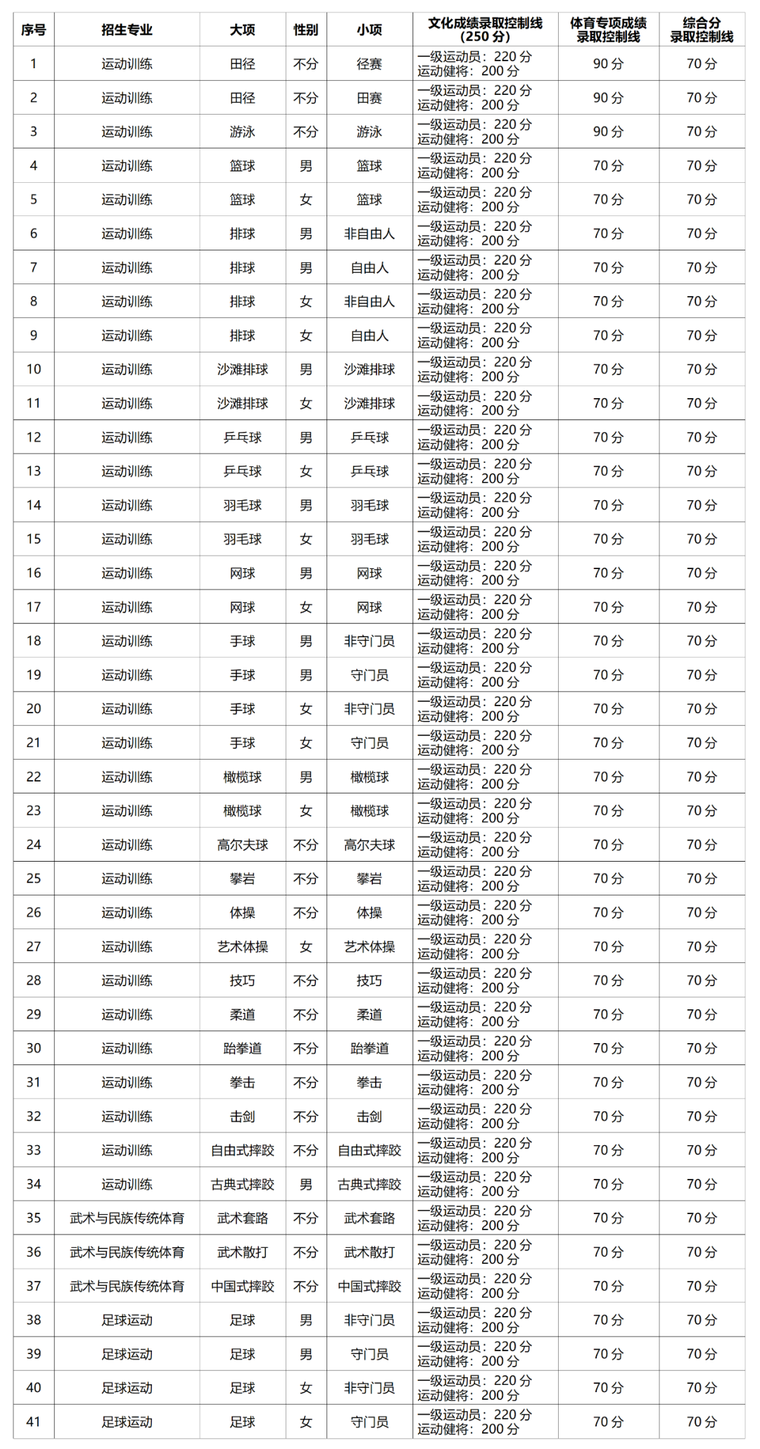 普通高等学校运动训练、武术与民族传统体育专业考试招生属于高校特殊类型考试招生,是高校招生工作的一部分。根据《体育总局办公厅 教育部办公厅关于印发〈2025年普通高等学校运动训练、武术与民族传统体育专业招生管理办法〉的通知》(体科字〔2024〕256号)的要求,结合我校实际情况,制定本简章。我校足球运动专业考试招生纳入运动训练专业考试招生,并按有关工作要求执行。1.符合2025年普通高校招生考试(以下简称普通高考)报名条件;2.具备我校招生项目的一级(含)以上运动员技术等级称号;(二)考生必须参加生源所在地省级招生考试机构组织的普通高考报名(具体按各省级招生考试机构要求执行)。(三)考生依据我校招生简章要求,统一在“中国运动文化教育网”(www.ydyeducation.com)或“体教联盟APP”中“普通高等学校运动训练、武术与民族传统体育专业招生系统”(以下简称“体育单招系统”)进行注册(验证考生报名资格)并报名,具体时间:注册时间为2025年2月1日12:00至3月10日12:00报名时间为2025年3月1日12:00至3月10日12:00(四)考生运动员技术等级以“国家体育总局运动员技术等级系统”公示的数据信息为准。考生本人的运动员技术等级项目应与报考的招生项目一致,考生如具备所报考项目的多个运动员技术等级证书,报名时需填报所有符合报名要求的运动员技术等级证书。(五)2025年报名考生的等级证书审批日期为:2015年1月1日至2025年3月10日。(六)考生根据招生院校公布的招生简章合理选择不超过2所招生院校进行报名,并确定好志愿顺序。(七)身体健康,符合《普通高等学校招生体检工作指导意见》要求。1.上海体育大学是普通公办高等学校。运动训练、武术与民族传统体育、足球运动专业是国家计划内的全日制本科专业,学制四年。面向全国招生,不列分省计划。2.运动训练专业招生计划为280人,武术与民族传统体育专业招生计划为80人,足球运动专业招生计划为60人,招生计划含保送录取优秀运动员。运动训练、武术与民族传统体育、足球运动专业招生实行文化考试和体育专项考试相结合的办法进行。1.文化考试科目为语文、数学、政治、英语四科,每科满分为150分,四科满分为600分,使用国家通用语言文字作答。所有考生必须参加普通高考报名所在地省级招生考试机构组织的文化考试。2.考生应按照体育总局办公厅发布的《普通高等学校运动训练、武术与民族传统体育专业招生文化考试大纲(2023版)》准备文化考试。3.考生于2025年3月22日12:00后登录“体育单招系统”打印文化考试准考证。4.考生依据准考证上的考点信息于3月29日、30日参加文化考试。1.体育专项考试采用全国统考方式进行,满分100分。体育总局委托有关院校组织体育专项考试,按照体育总局制定的《普通高等学校运动训练、武术与民族传统体育专业体育专项考试方法与评分标准(2025版)》评分。2.考生依据报名项目进行体育专项考试,不得跨项参加考试。3.考生应签订《反兴奋剂承诺书》,拒不签订承诺书的考生,视为主动放弃考试资格;兴奋剂违规的考生,视为考试作弊,取消考试资格或录取资格,并通报生源所在省级招生考试机构,按照有关规定严肃处理。4.考生可通过“中国运动文化教育网”“体教联盟APP”或组考院校官网,查询体育专项考试具体安排、考生须知等信息,按要求参加体育专项考试。1.在达到我校录取控制线的基础上(详见附件),我校根据考生的文化成绩(折合百分制后)和体育专项成绩3:7的比例进行综合评价,计算考生录取综合分。具体公式:综合分=(文化成绩/6)×30%+体育专项成绩×70%。综合分计算时保留小数点后两位,采用四舍五入计数保留法。2.根据本校实际情况和专业需求分项目制定招生计划,并在夏季项目考试前公布。3.对录取控制线上的考生,按照综合分由高到低录取。综合分相同时,依次按体育专项成绩、文化成绩、语文成绩、数学成绩、政治成绩、英语成绩由高到低排序。我校依据梯次顺序,优先录取一志愿,未完成我校招生计划,再录取二志愿。若项目的合格生源不足,该项目的剩余计划不再调整到其他项目。4.考生若已报名运动训练、武术与民族传统体育、足球运动专业志愿并被录取,不再参加普通高考及高校高水平运动队的录取。1.运动训练、武术与民族传统体育、足球运动专业学生入学后不得转入其他专业学习。2.修学期满,符合毕业要求,颁发上海体育大学本科毕业证书。符合学士学位授予条件的,授予教育学学士学位。3.收费标准:学费7700元/学年,住宿费1200元/学年。4.考生弄虚作假,或发生考试违规违纪行为,经查实,依据《国家教育考试违规处理办法》和《普通高等学校招生违规处理暂行办法》,取消其考试资格或录取资格,已入学者,取消其入学资格;构成犯罪的,依法追究刑事责任。5.若教育部、体育总局及生源所在地省级招生考试机构等对招生有新的规定,则按新的规定执行。《上海体育大学2025年运动训练、武术与民族传统体育、足球运动专业招生简章》附件: