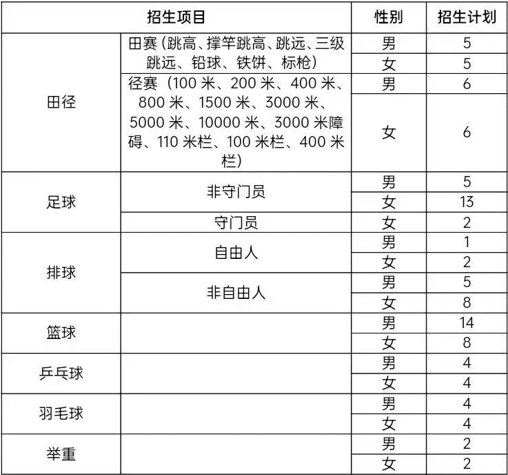 (一)招生项目:田径、足球(十一人制)、篮球、排球、乒乓球、羽毛球、举重。