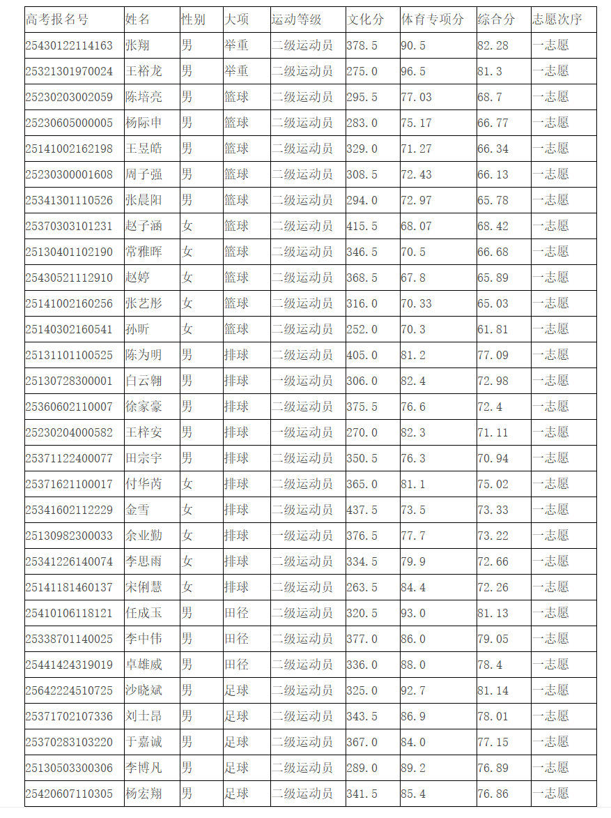 按照《2025年普通高等学校运动训练、武术与民族传统体育专业招生管理办法》(体科字〔2024〕256号)及《齐齐哈尔大学2025年运动训练专业招生简章》等文件要求,现对我校2025年运动训练专业拟录取名单进行公示,公示时间:2025年5月26日至2025年5月30日,如对拟录取考生有异议,可在公示期内实名书面向我校招生就业处反映,反映情况和问题必须实事求是,对线索不清的匿名信和匿名电话,公示期间不予受理。