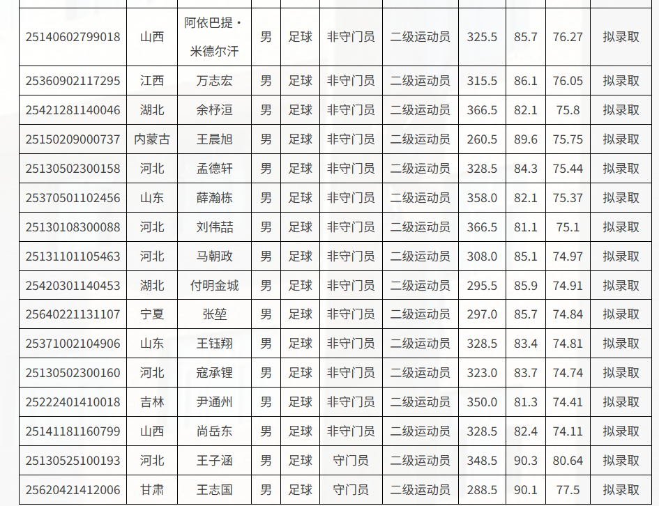 伊犁师范大学2025年足球运动专业拟录取名单公示