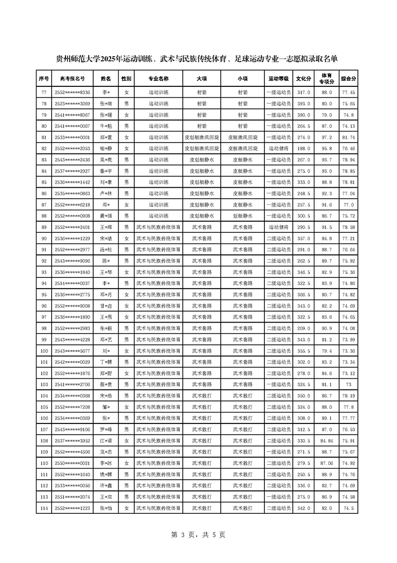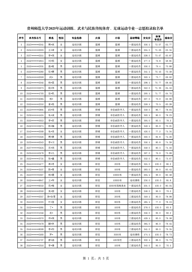 根据教育部、国家体育总局《2025年普通高校运动训练、武术与民族传统体育专业招生管理办法》(体科字〔2024〕256号)、《贵州师范大学2025年运动训练、武术与民族传统体育、足球运动专业招生简章》等相关文件要求,现将贵州师范大学运动训练、武术与民族传统体育、足球运动专业一志愿拟录取名单进行公示,正式录取名单以教育部、国家体育总局、各省招生部门审核通过为准。