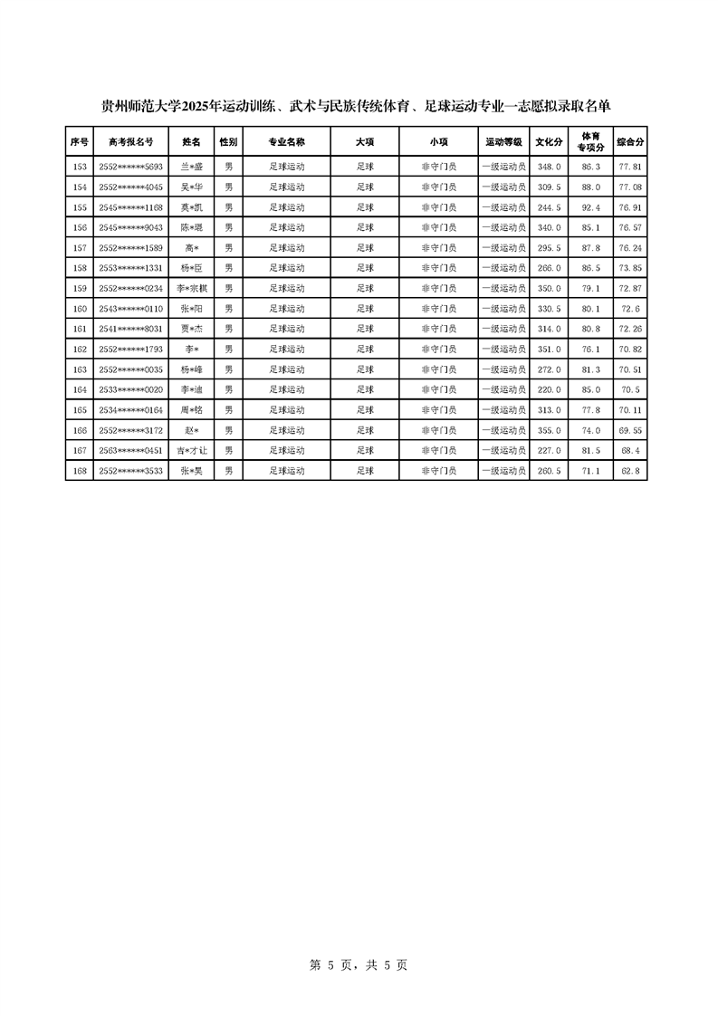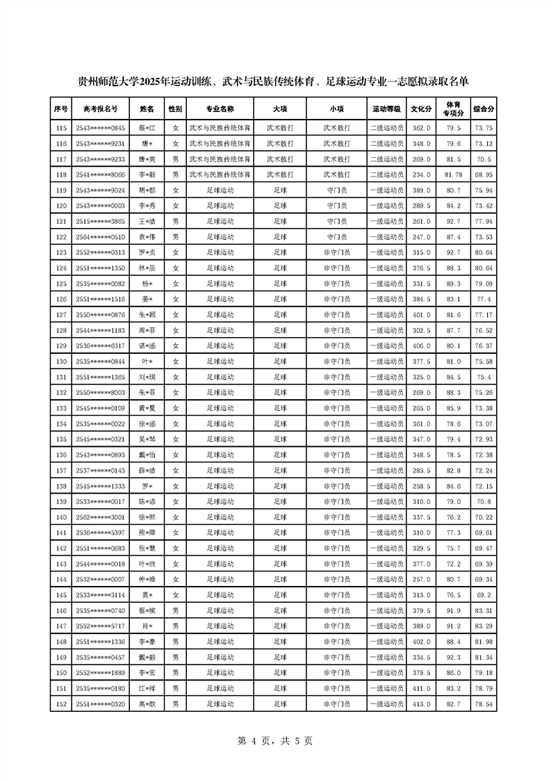 关于2025年贵州师范大学运动训练、武术与民族传统体育、足球运动专业一志愿拟录取情况的公示