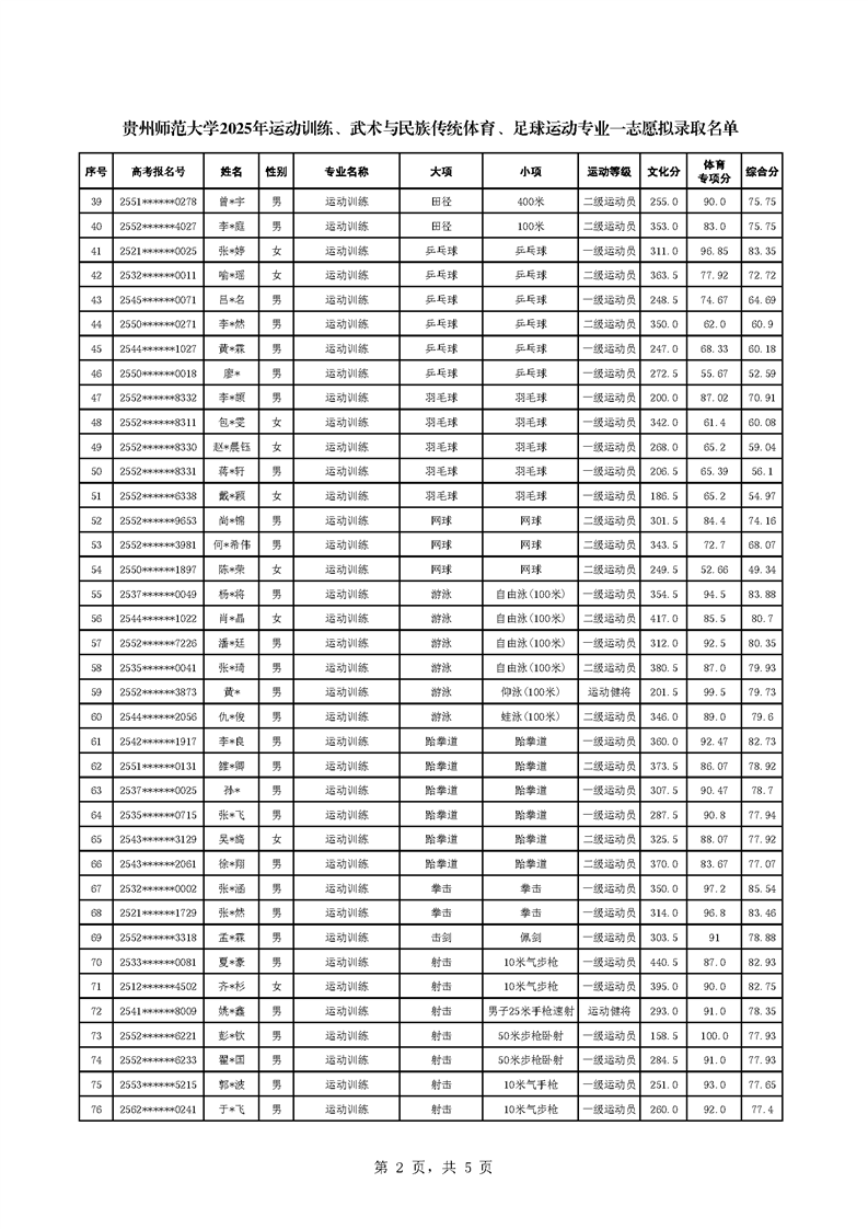 贵州师范大学2025年体育单招拟录取名单