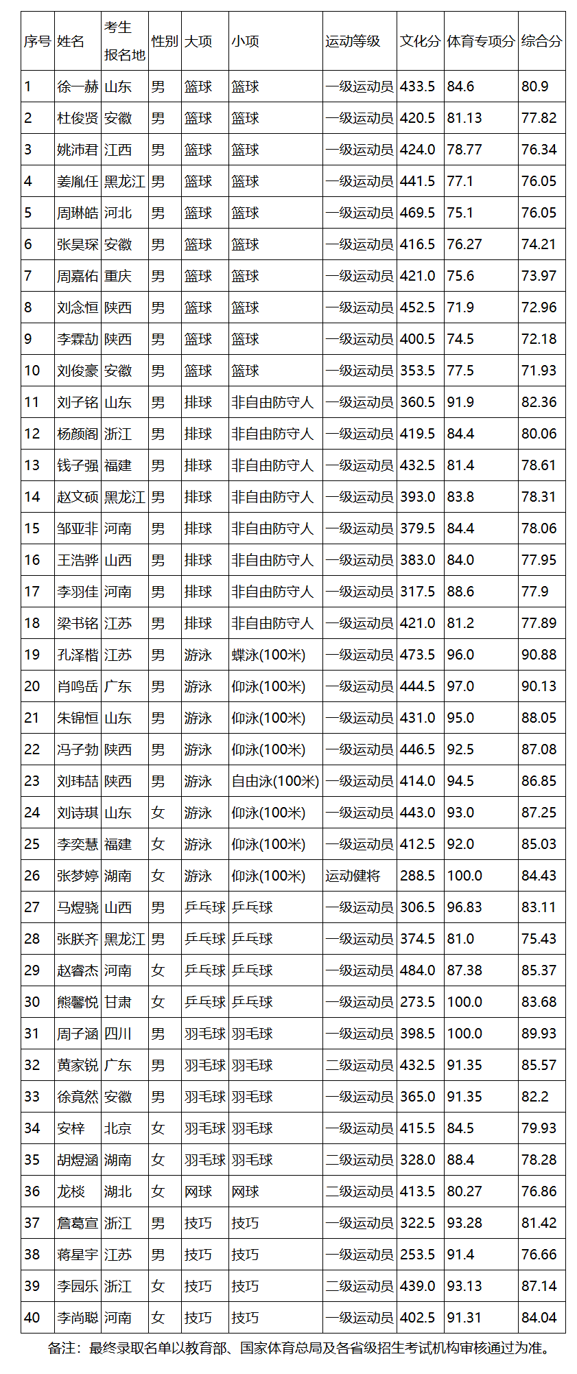 按照国家体育总局《2025年普通高等学校运动训练、武术与民族传统体育专业招生管理办法》和《西安电子科技大学2025年运动训练专业招生简章》相关规定,在达到我校文化成绩和体育专项成绩最低录取控制线的基础上,根据考生志愿和各项目招生计划按综合分从高到低划定拟录取考生名单。现将一志愿拟录取考生名单进行公示。