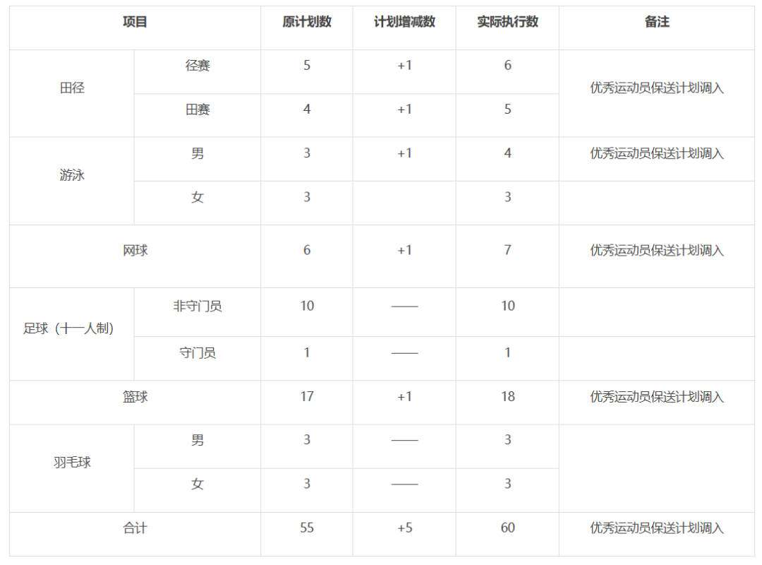 学校运动训练单招原计划为55人,因优秀运动员保送生无合格生源,计划5人调入运动训练单招。