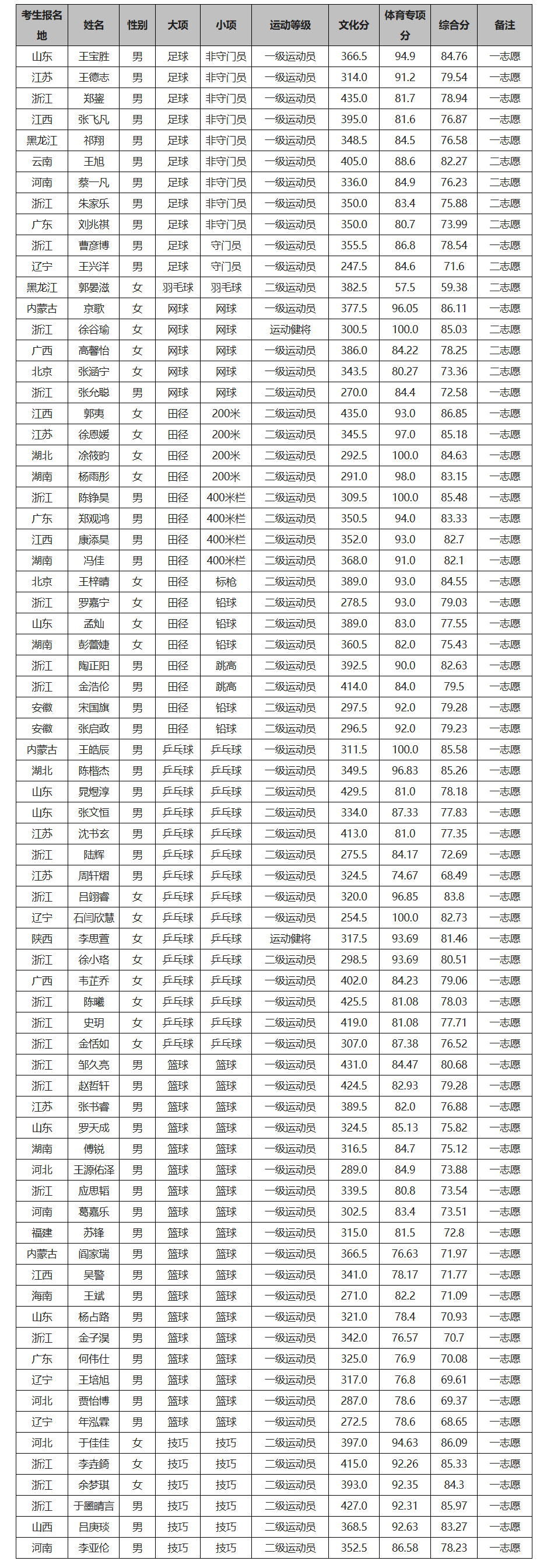 2.体育专项成绩录取控制线:男子篮球项目不低于75分;男子足球项目不低于80分;男、女乒乓球项目不低于60分;男、女技巧项目不低于80分;男、女网球项目不低于75分;女子羽毛球和男、女田径项目不低于40分。