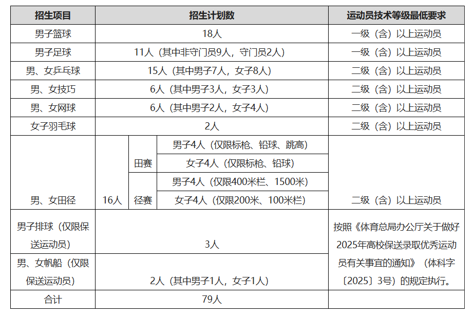 2025年我校运动训练专业分9个项目招生,总计划为79人,具体招生项目和招生计划数如下: