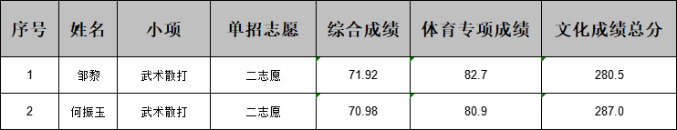 现将武术散打二志愿拟录取名单公示如下: