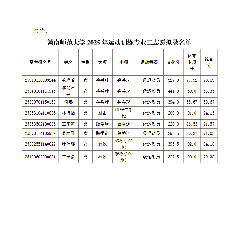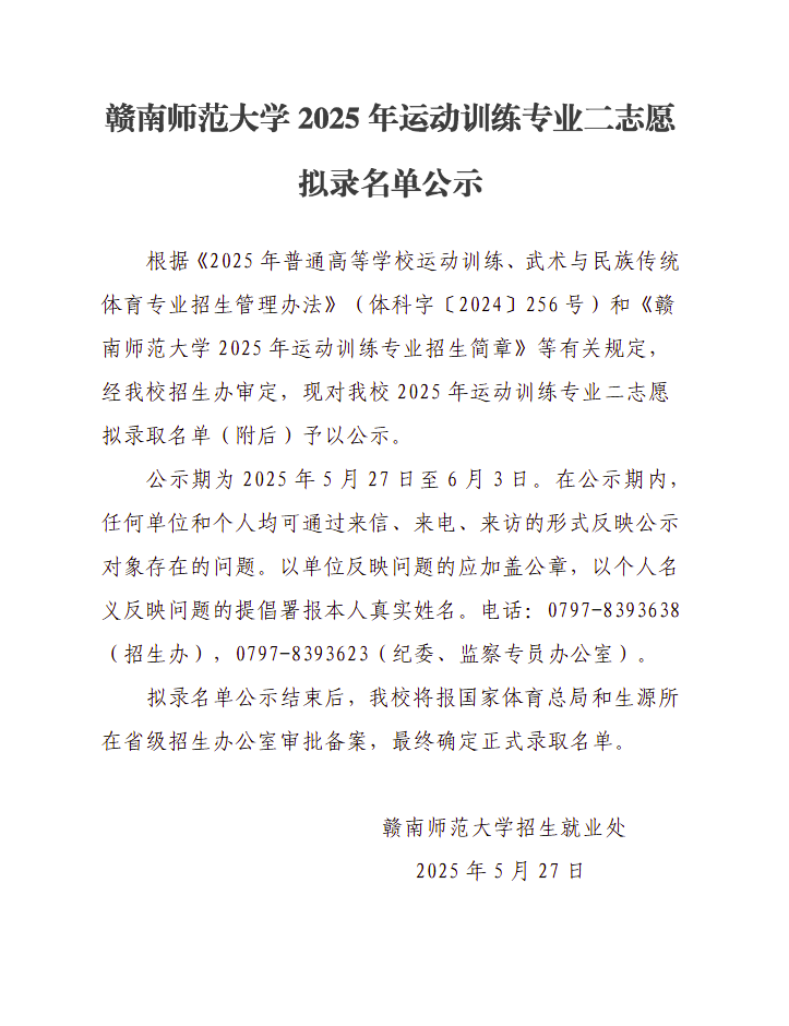 赣南师范大学2025年运动训练专业二志愿拟录考生名单公示