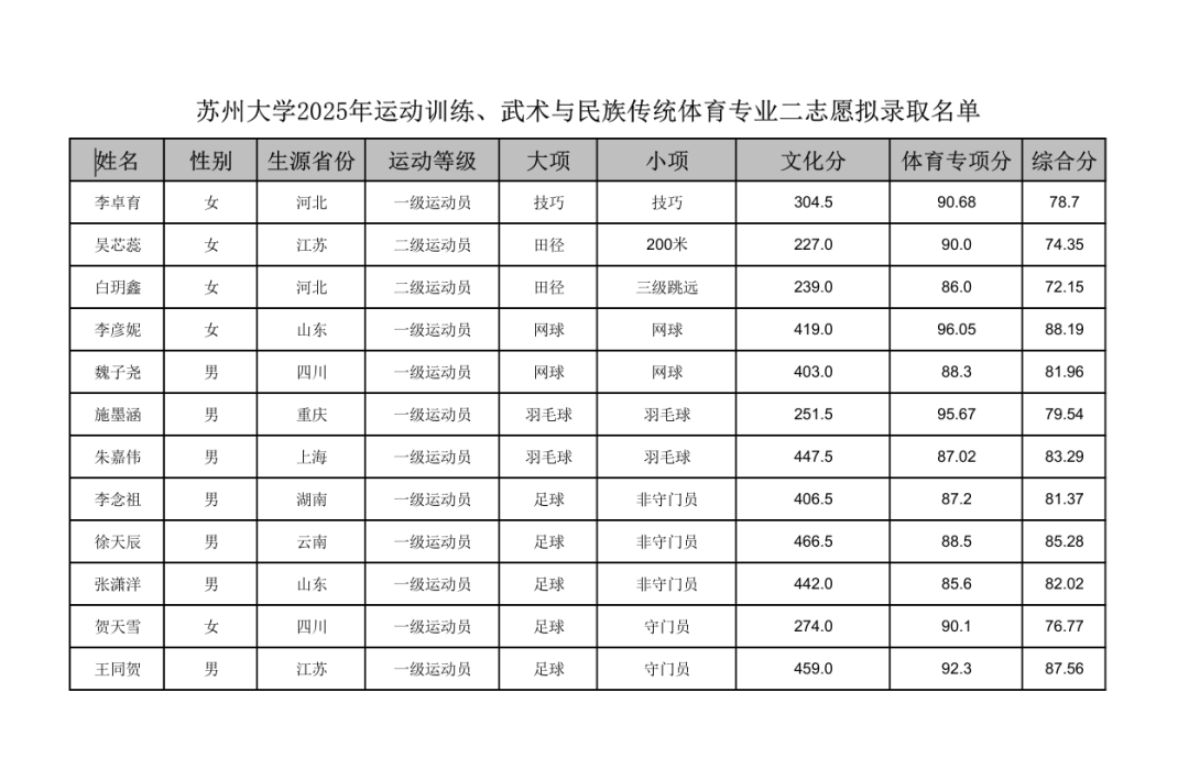 苏州大学2025年运动训练、武术与民族传统体育专业二志愿拟录取名单公示