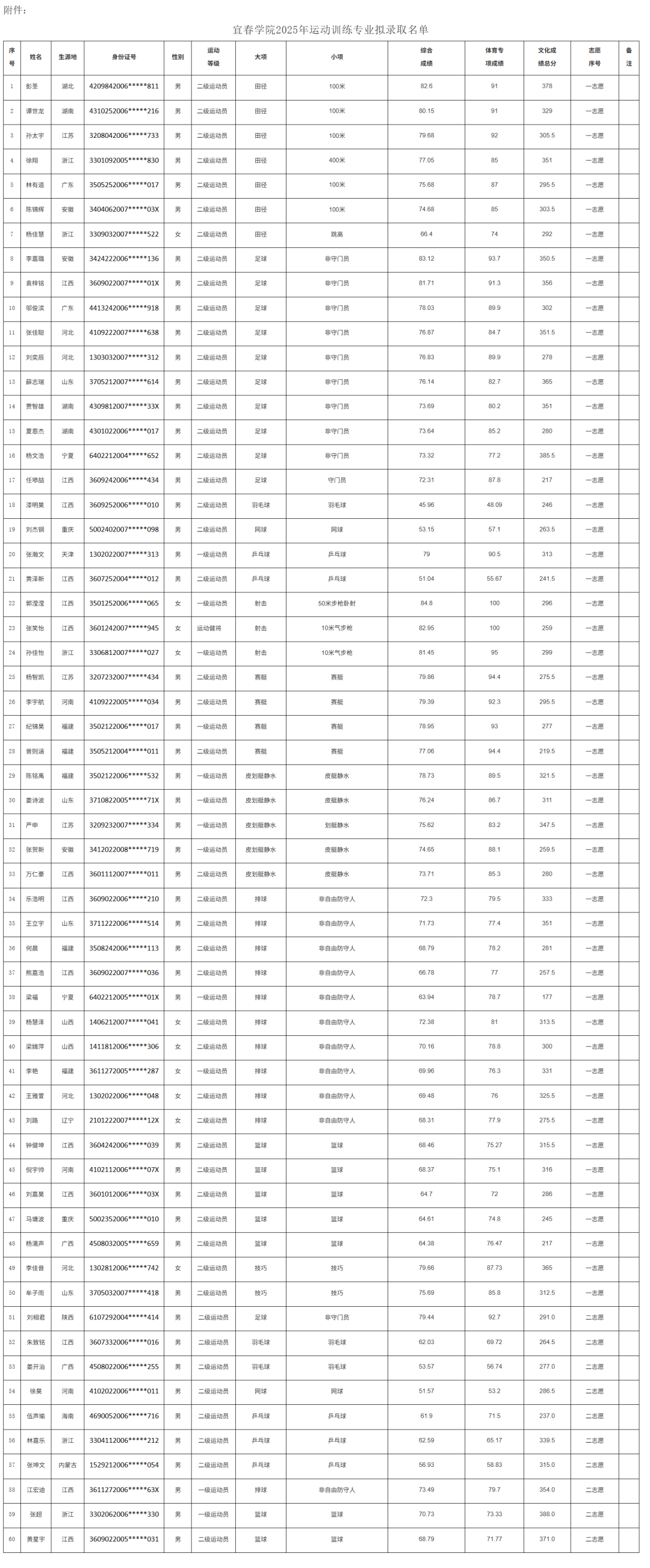 附件:宜春学院2025年运动训练专业拟录取名单