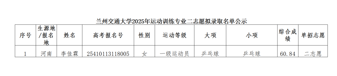 根据《2025年普通高等学校运动训练、武术与民族传统体育专业招生管理办法》(体科字〔2024〕256号)和《兰州交通大学2025年运动训练专业招生简章》等相关文件要求,拟录取符合条件的二志愿考生1人,现将拟录取名单予以公示,具体名单如下: