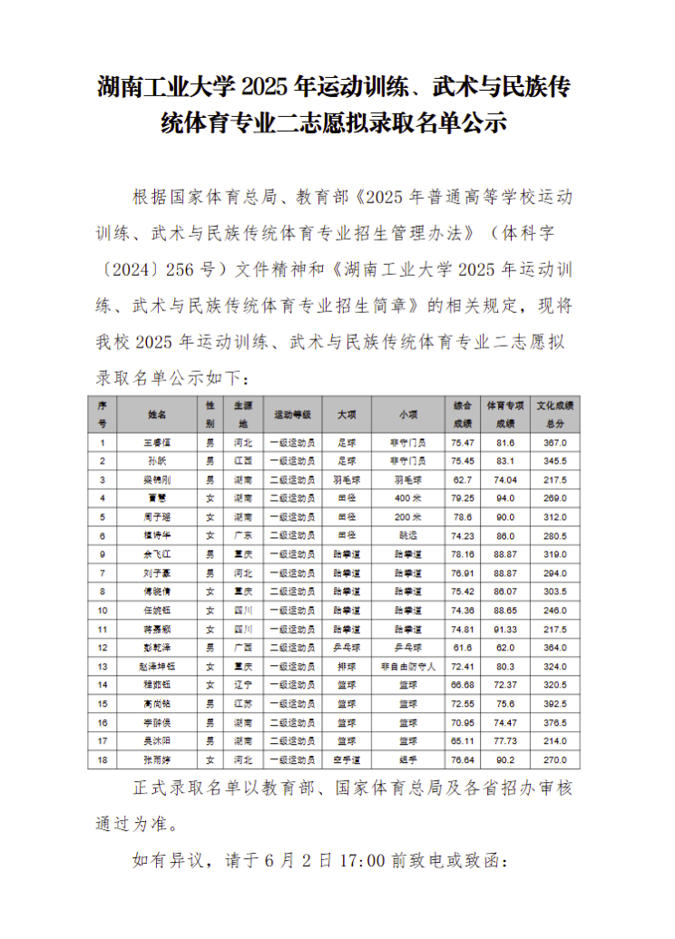 湖南工业大学2025年体育单招拟录取名单(二志愿)