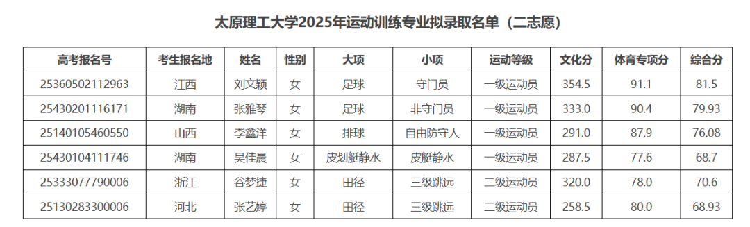 根据《2025年普通高等学校运动训练、武术与民族传统体育专业招生管理办法》和《太原理工大学2025年运动训练专业招生简章》的相关规定,我校按照招生项目计划,依据上线考生综合分从高到低确定二志愿拟录取名单,现将拟录取考生名单进行公示(名单附后)。