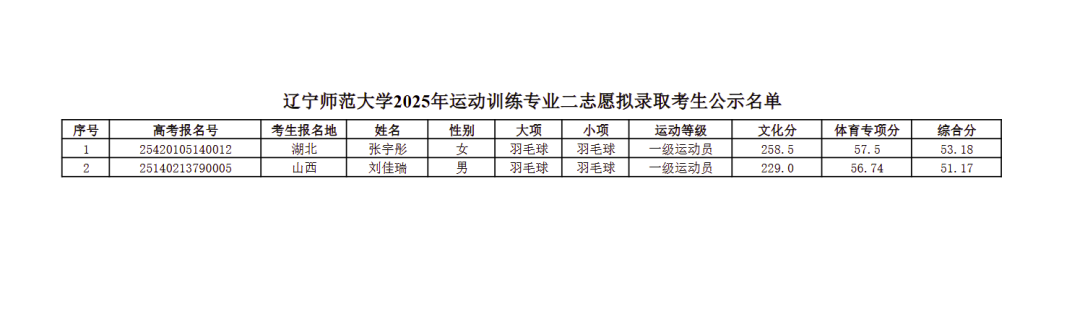 辽宁师范大学2025年运动训练专业二志愿拟录取考生名单公示
