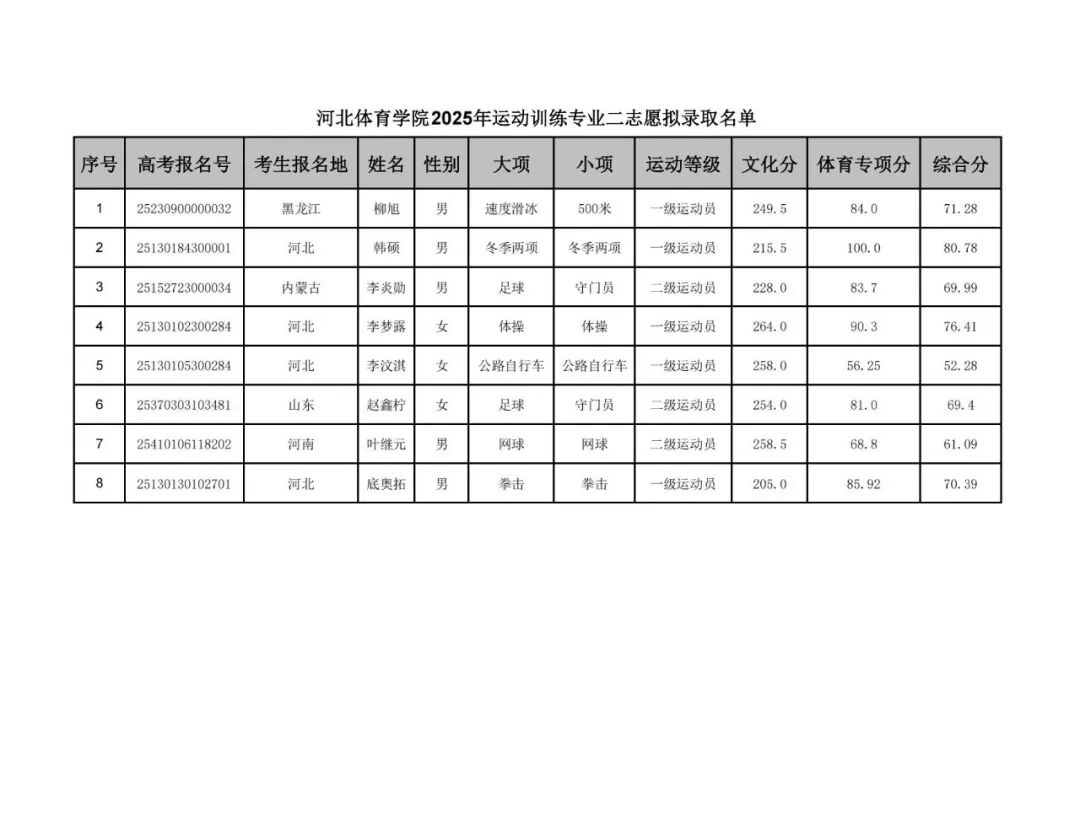 根据《体育总局办公厅、教育部办公厅关于印发<2025年普通高等学校运动训练、武术与民族传统体育专业招生管理办法>的通知》(体科字〔2024〕256号)、《河北体育学院2025年运动训练、武术与民族传统体育专业招生简章》《河北体育学院关于公布2025年运动训练、武术与民族传统体育专业分项目招生计划的通知》等相关文件要求,现将河北体育学院2025年运动训练专业二志愿拟录取名单进行公示,具体名单详见附件: