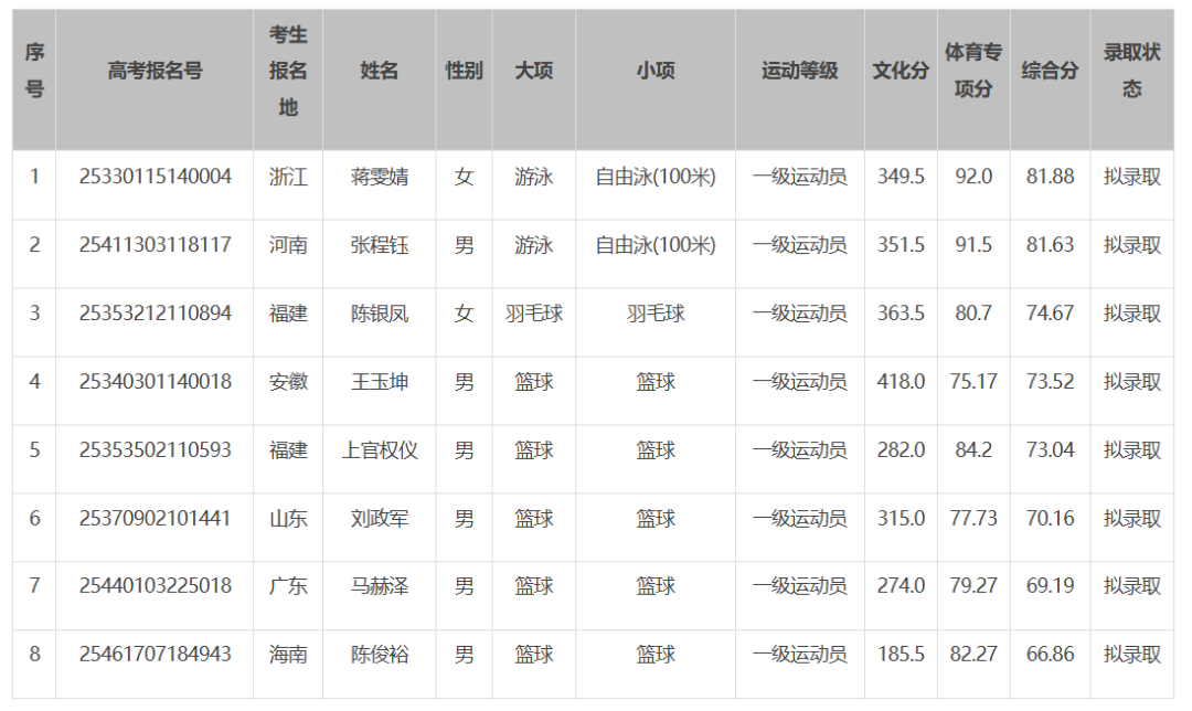 根据国家体育总局办公厅和教育部办公厅制定的《2025年普通高等学校运动训练、武术与民族传统体育专业招生管理办法》(体科字〔2024〕256号)和《华侨大学2025年运动训练专业招生简章》等文件规定,学校确定2025年运动训练专业拟录取名单,正式录取名单以教育部、国家体育总局及各省招生部门审核通过为准。具体如下:
