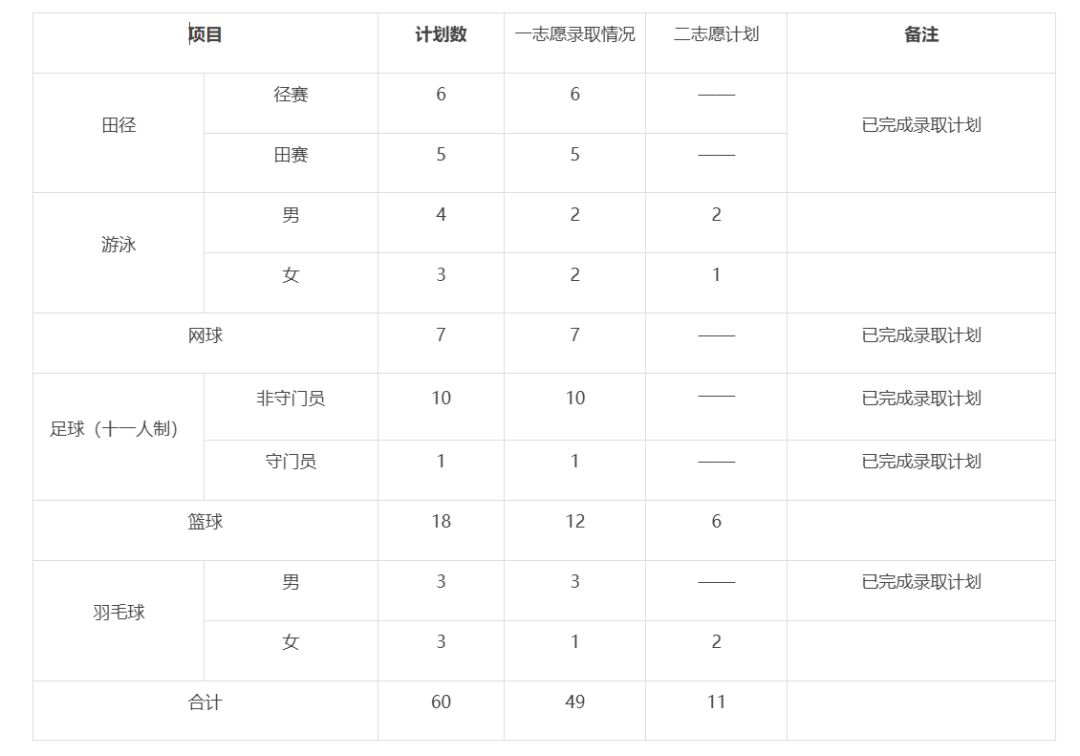 2.体育专项成绩最低录取控制线:篮球(男子) 75分;游泳90分;羽毛球50分。