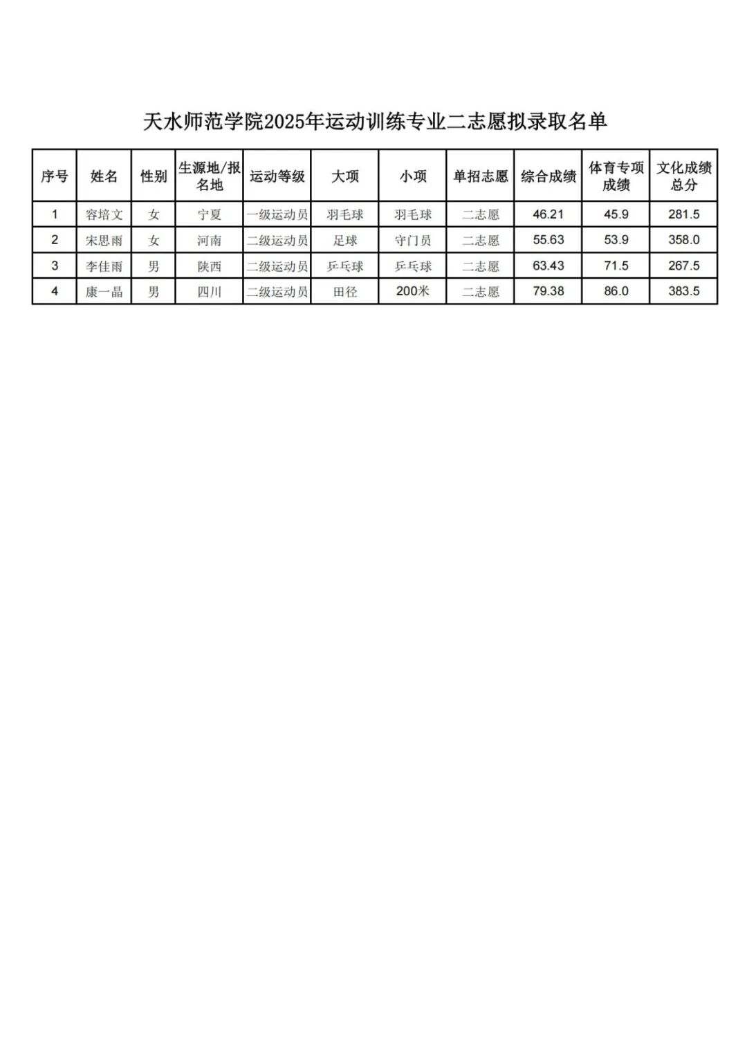 天水师范学院2025年运动训练专业二志愿拟录取名单公示