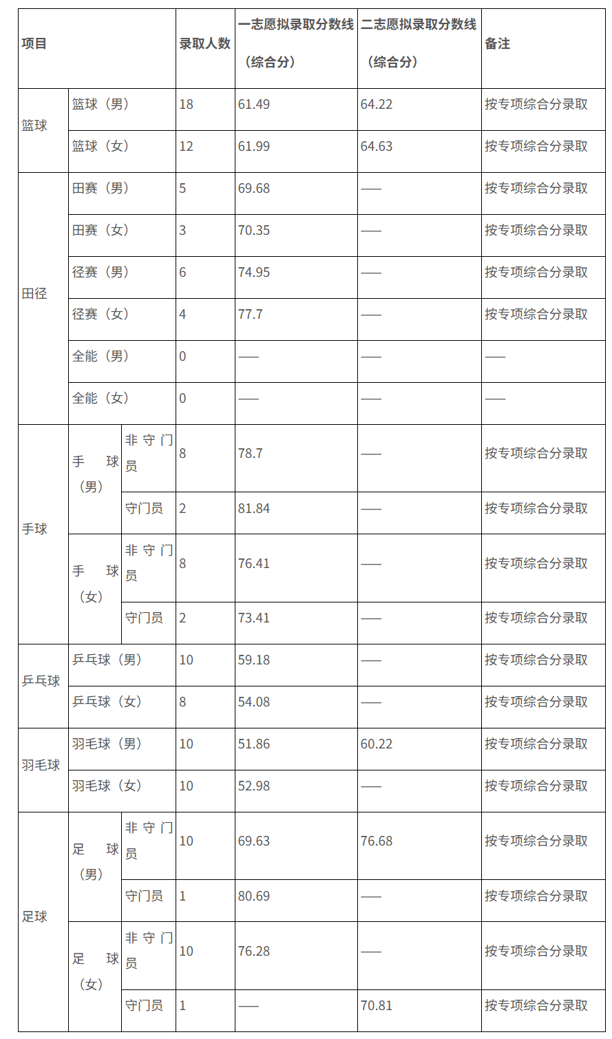 (二)体育专项成绩录取控制线:田径不低于70分;手球不低于85分;男子篮球不低于73分,女子篮球不低于67分;男子足球不低于78分,女子足球不低于75分;羽毛球和乒乓球不低于45分。
