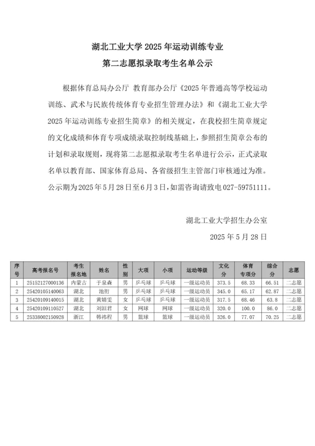 湖北工业大学 2025 年运动训练专业第二志愿拟录取考生名单公示