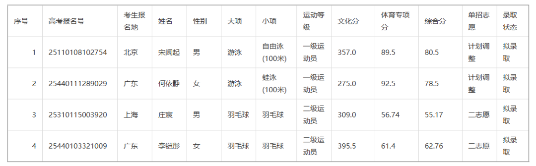 广东第二师范学院2025年体育单招拟录取名单(二志愿)