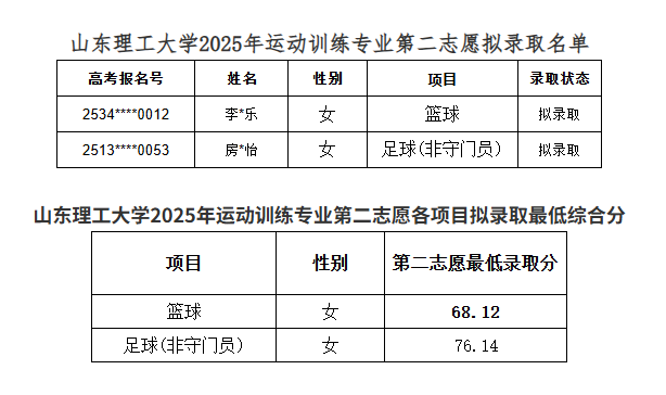 山东理工大学2025年运动训练专业第二志愿拟录取名单公示