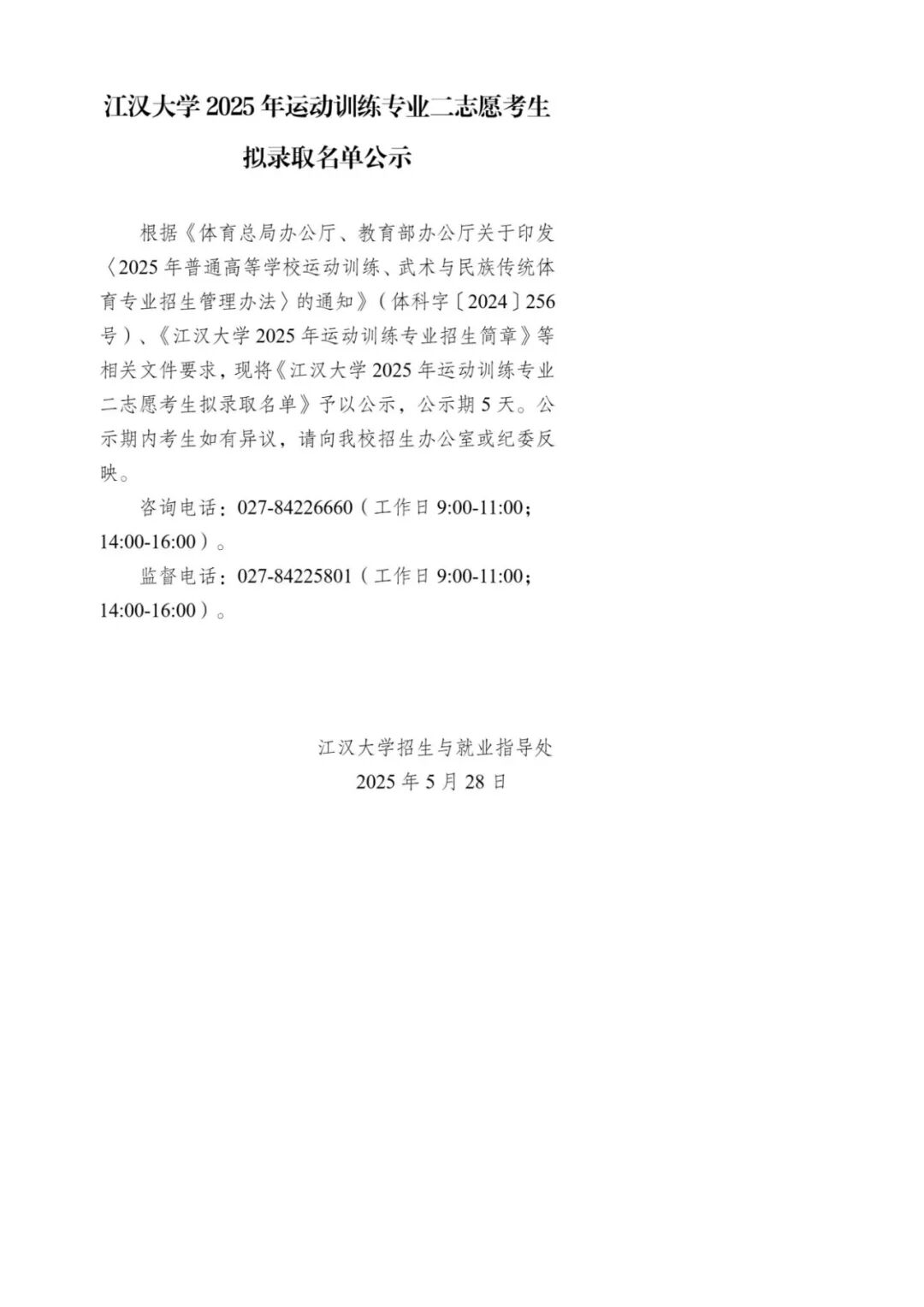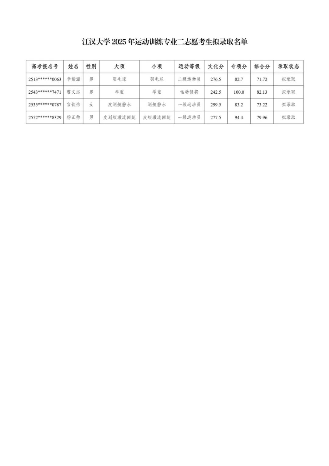 江汉大学2025年运动训练专业二志愿考生拟录取名单公示
