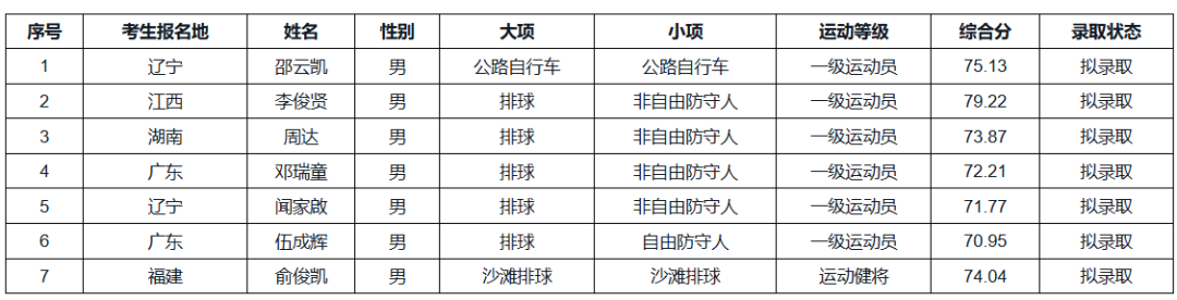 注:拟录取考生还须报国家体育总局和生源地省级招生部门进行审核备案,审核不合格者将不予录取。最终录取结果以国家体育总局和各省(区、市)招生主管部门审核为准。
