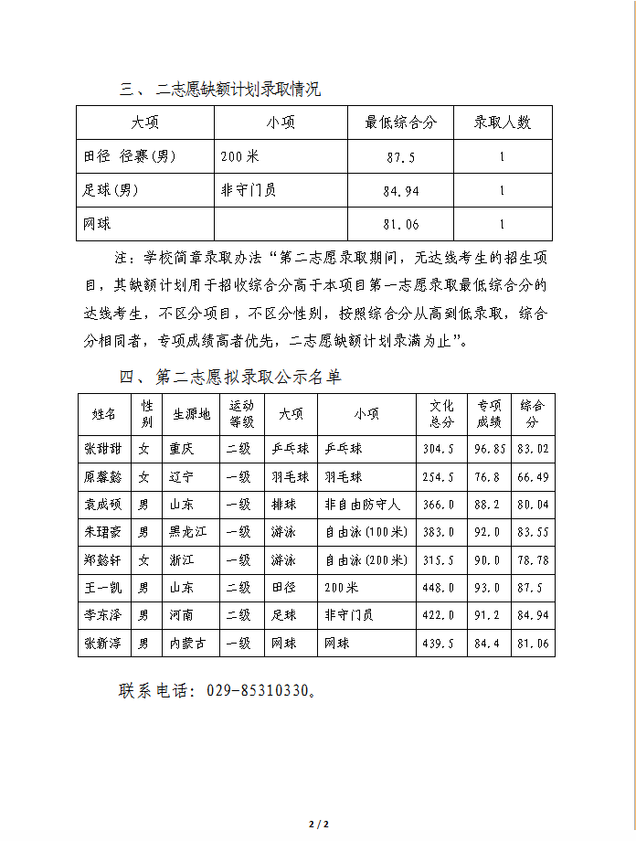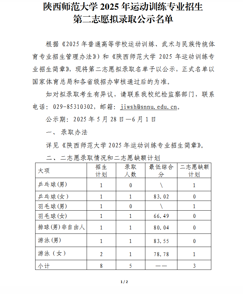 陕西师范大学2025年运动训练专业招生第二志愿考生拟录取公示名单