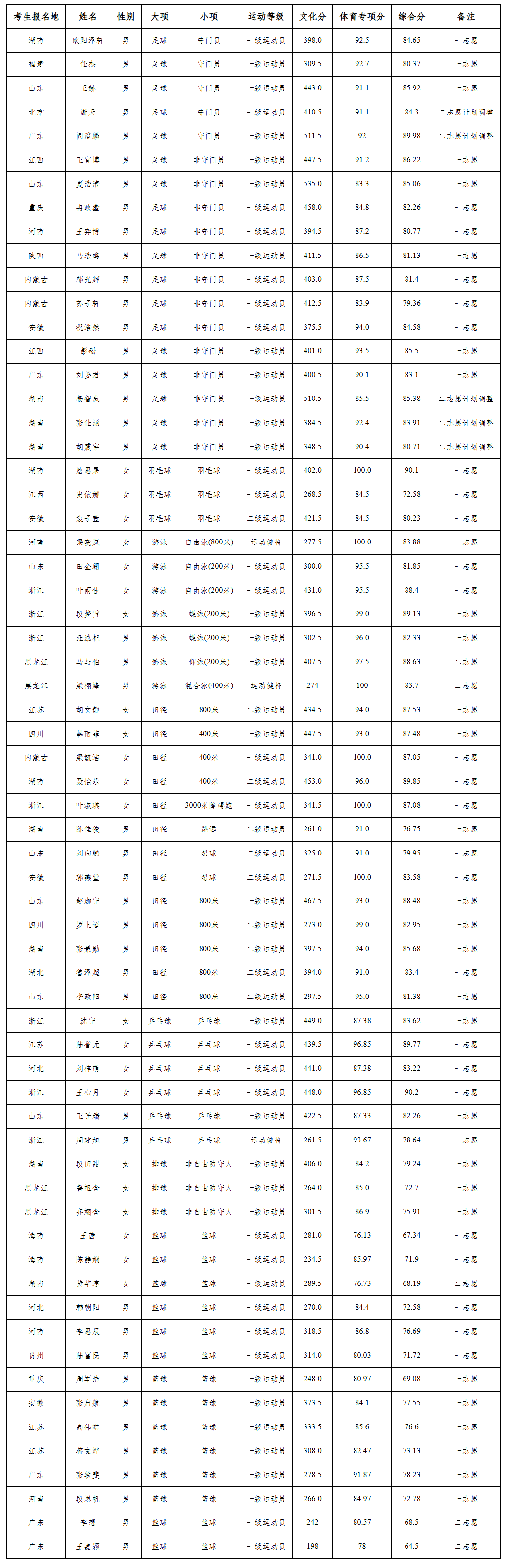 根据《中南大学2025年运动训练专业招生简章》的要求和规定,我校确定了2025年运动训练专业拟录取考生名单,现公示如下。