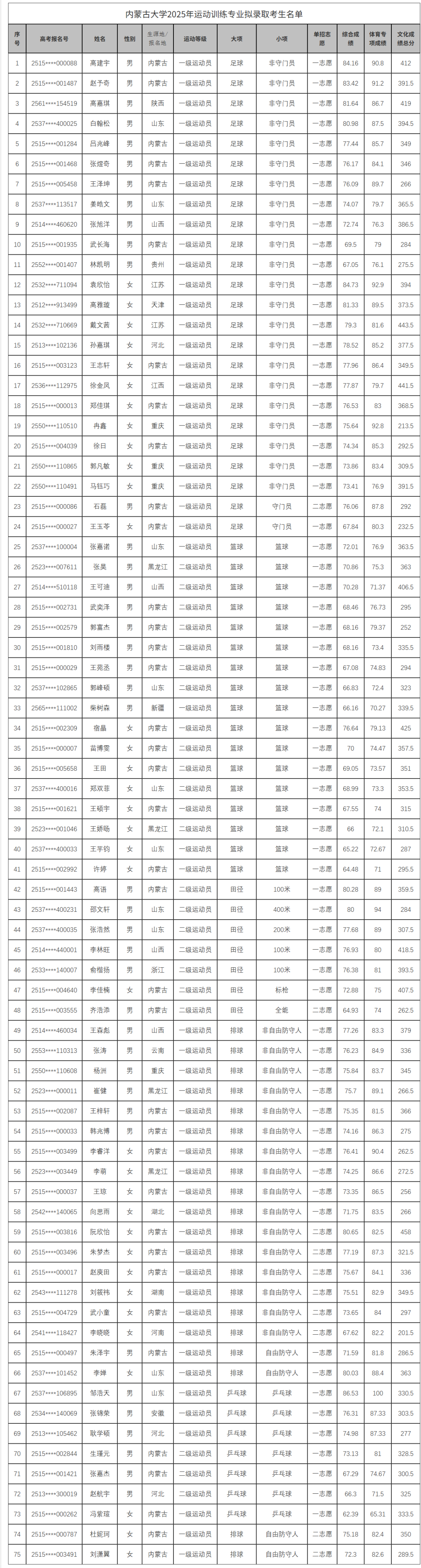 内蒙古大学2025年运动训练专业拟录取考生名单公示